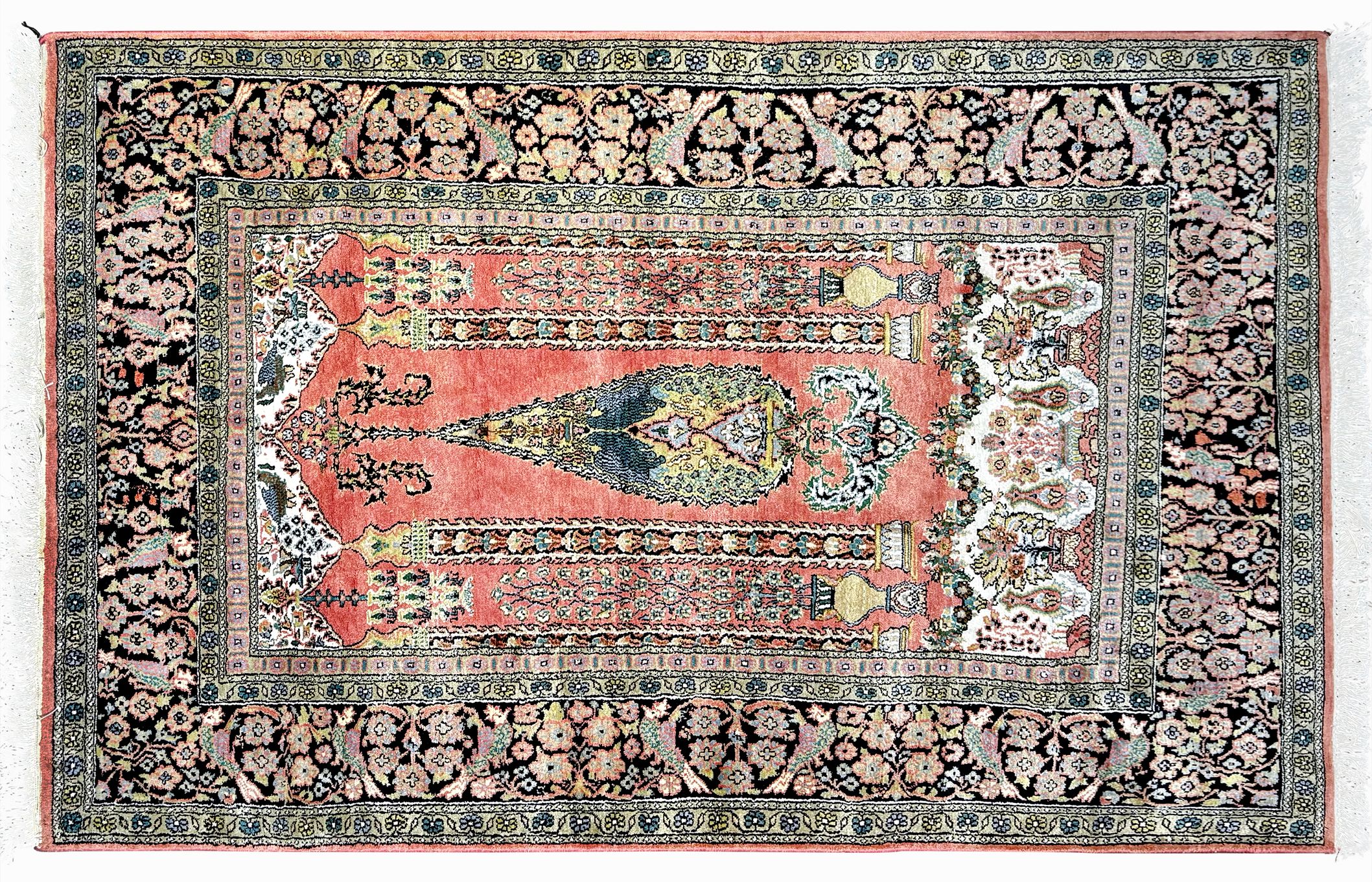 Soie à décor de vases fleuris sur fond corail, 185x120 cm