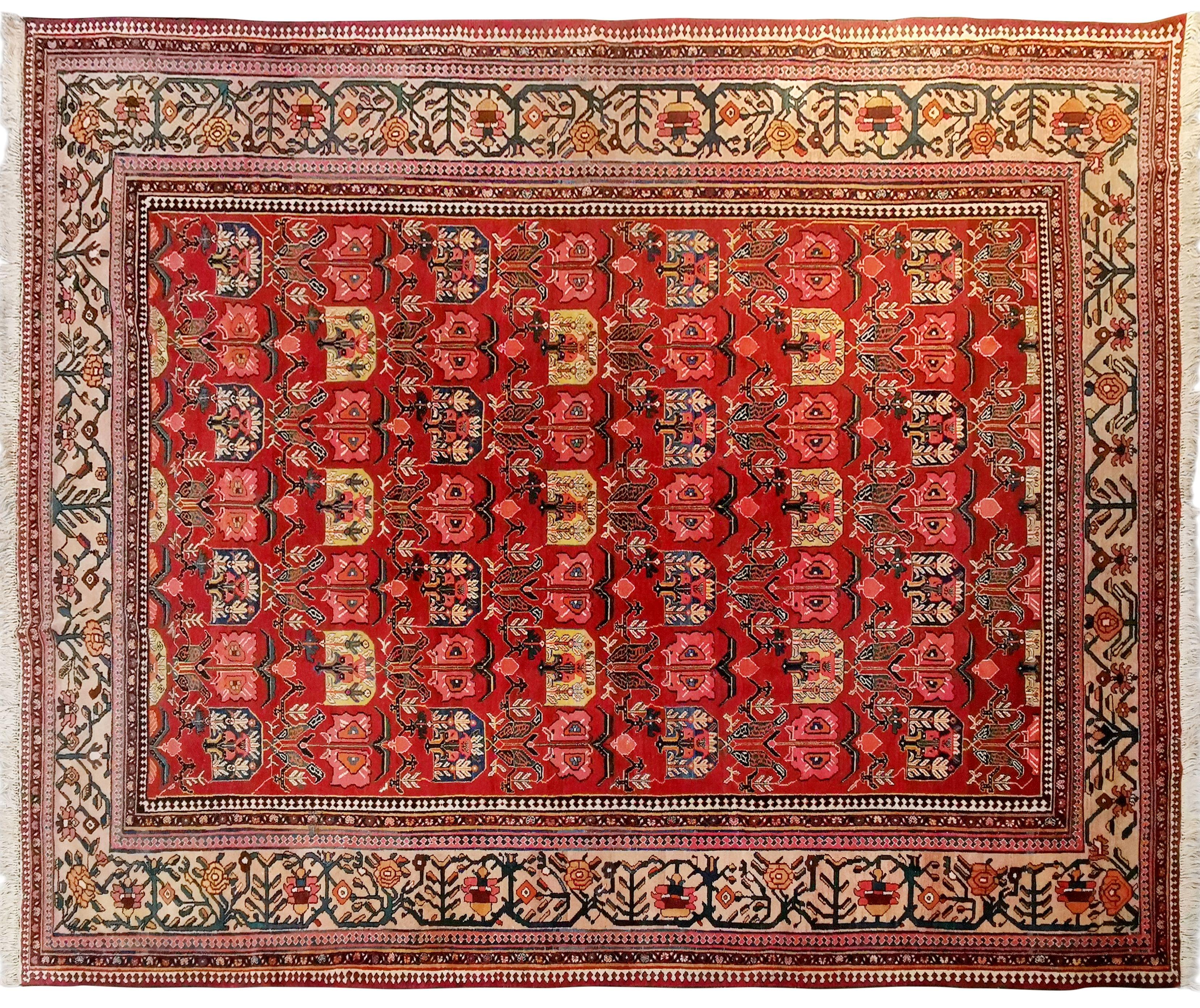 Rangées de bouquets de fleurs stylisés sur fond rouge, bordure multiple, 415x320 cm
