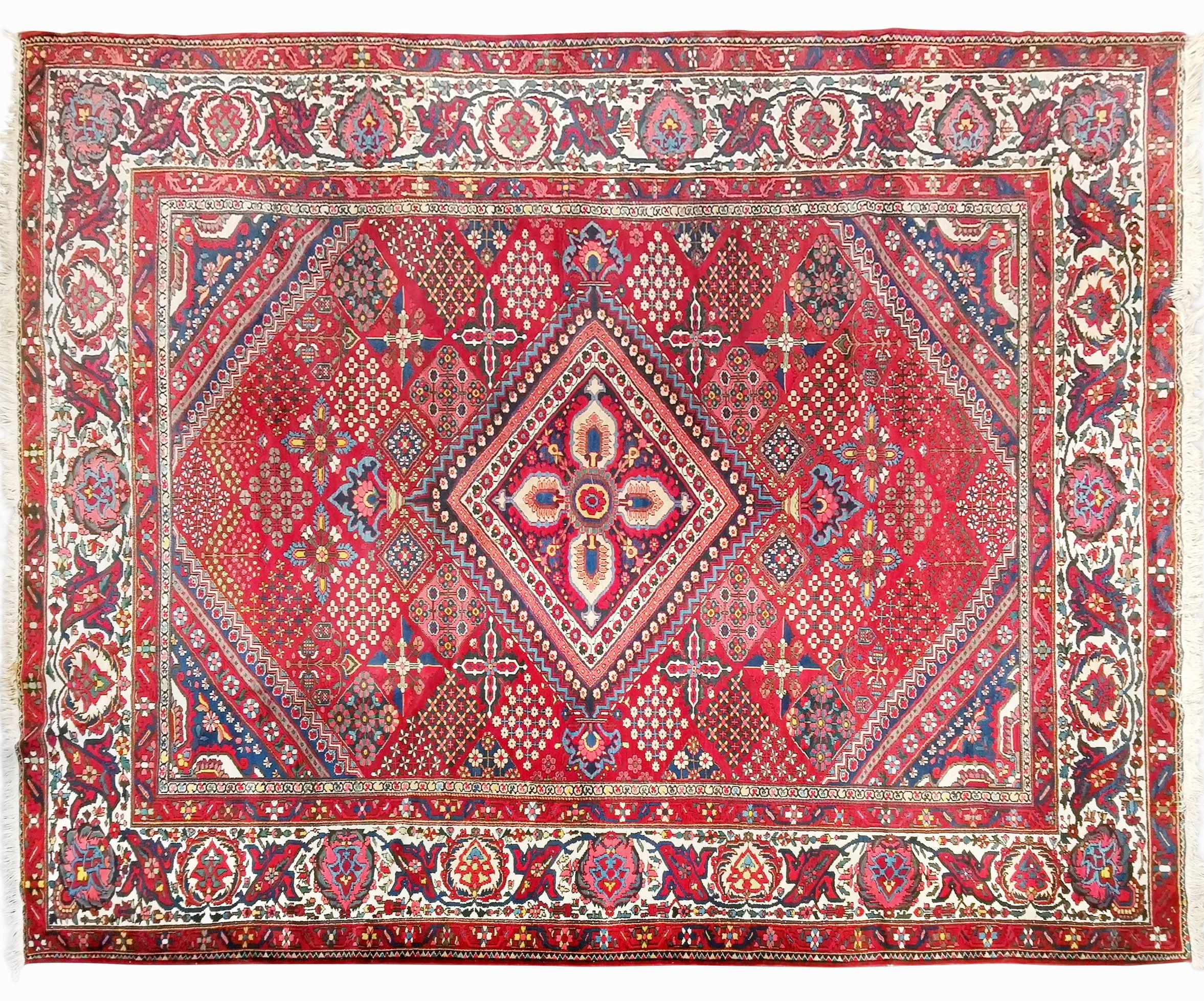 A motif central de losange sur fond rouge, bordure sur fond crème, 320x400 cm