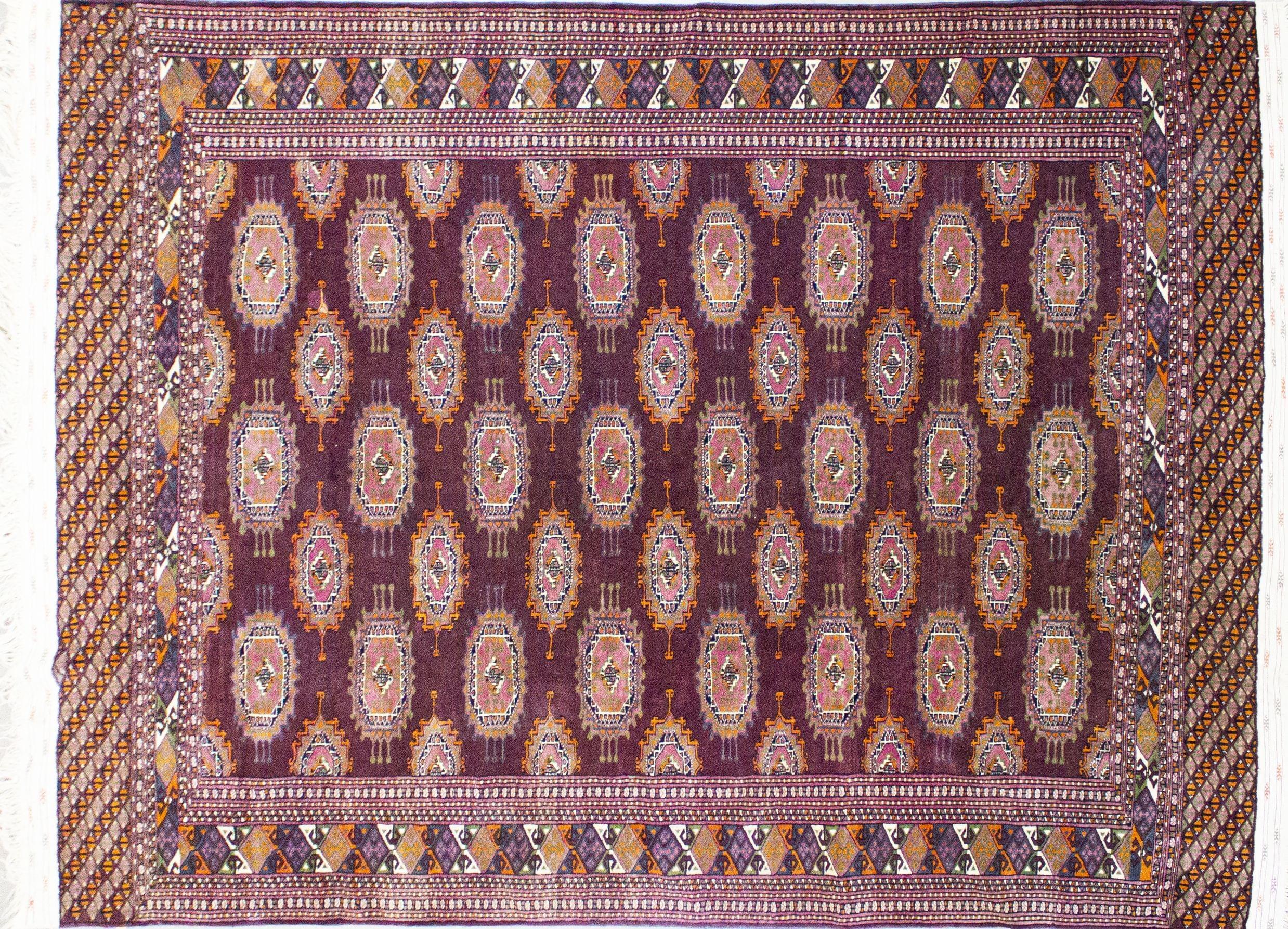 Laine à décor de botehs sur fond prune, bordures à croisillon ou motifs de crabes stylisés à décor géométrique, 276x184 cm