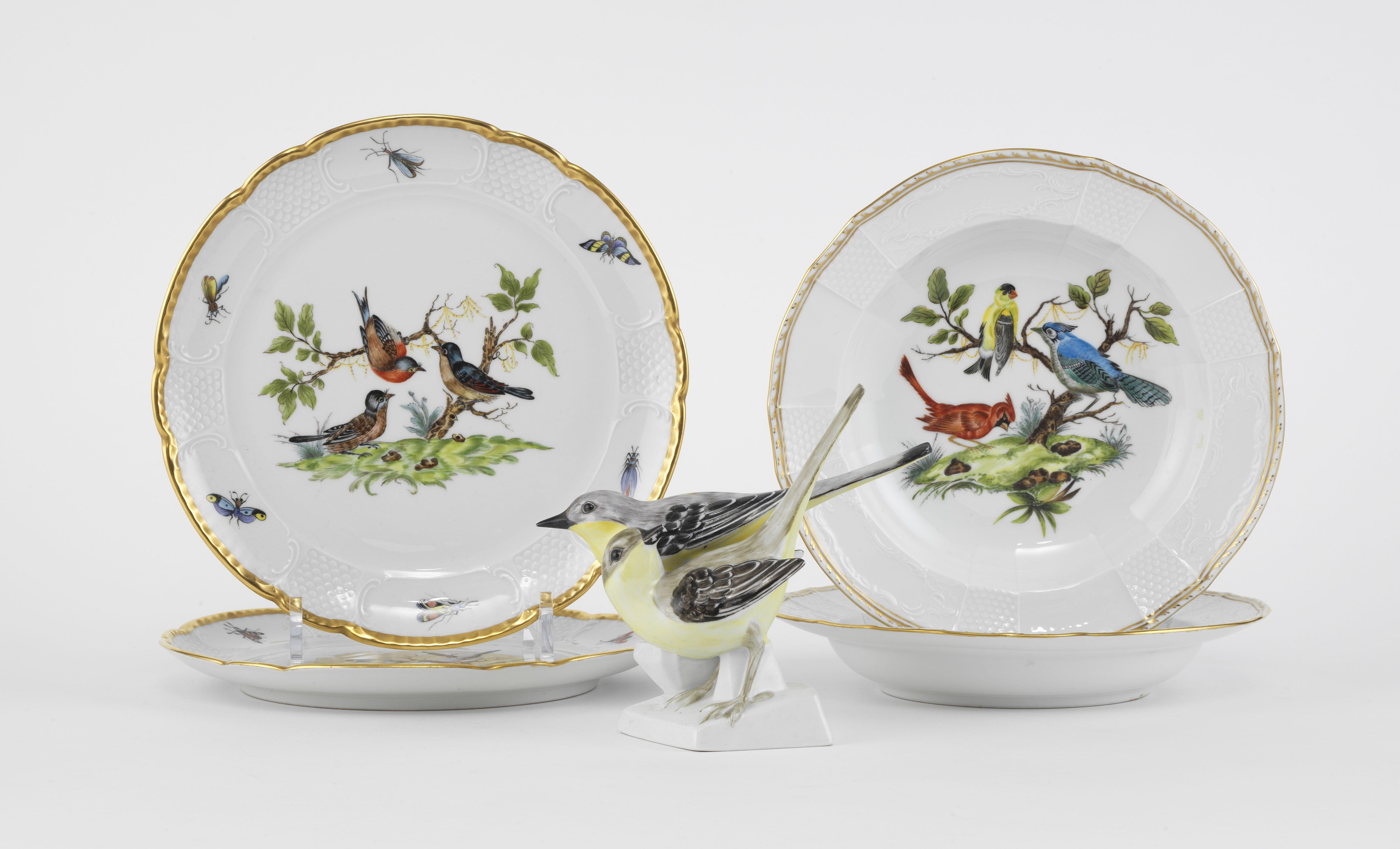 Décor peint à la main par Renée Rapin dans le style du XVIIIe s, porcelaine, comprenant: 2 assiettes à dîner, 2 creuses, 1 figurine, H 13,5 cm