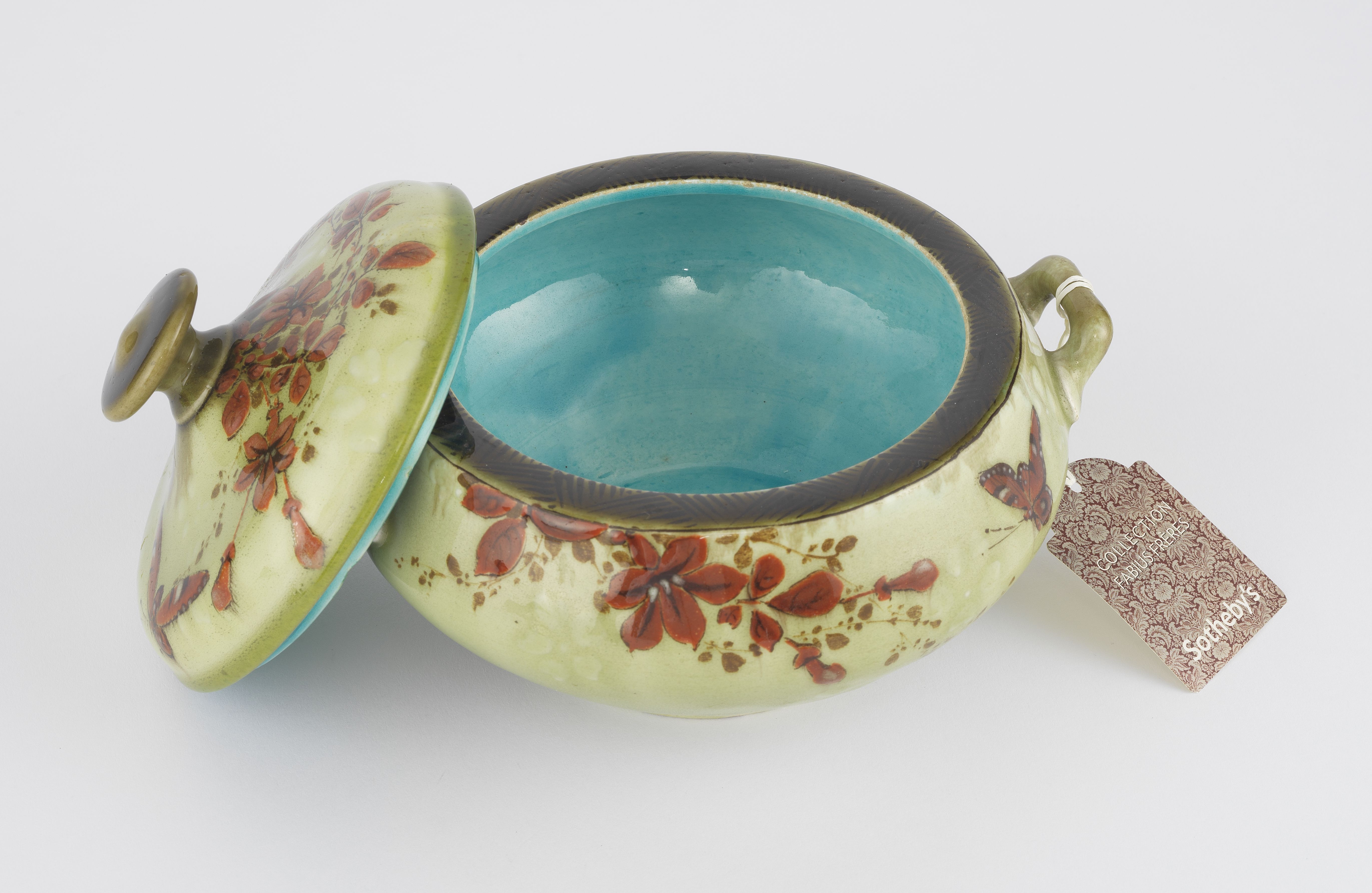 Bonbonnière à motif de papillons et fleurs sur fond céladon, signée, D 16 cm. Provenance: collection Fabius Sotheby 26 et 27 octobre 2011 ; Les Stern, une famille de collectionneurs.