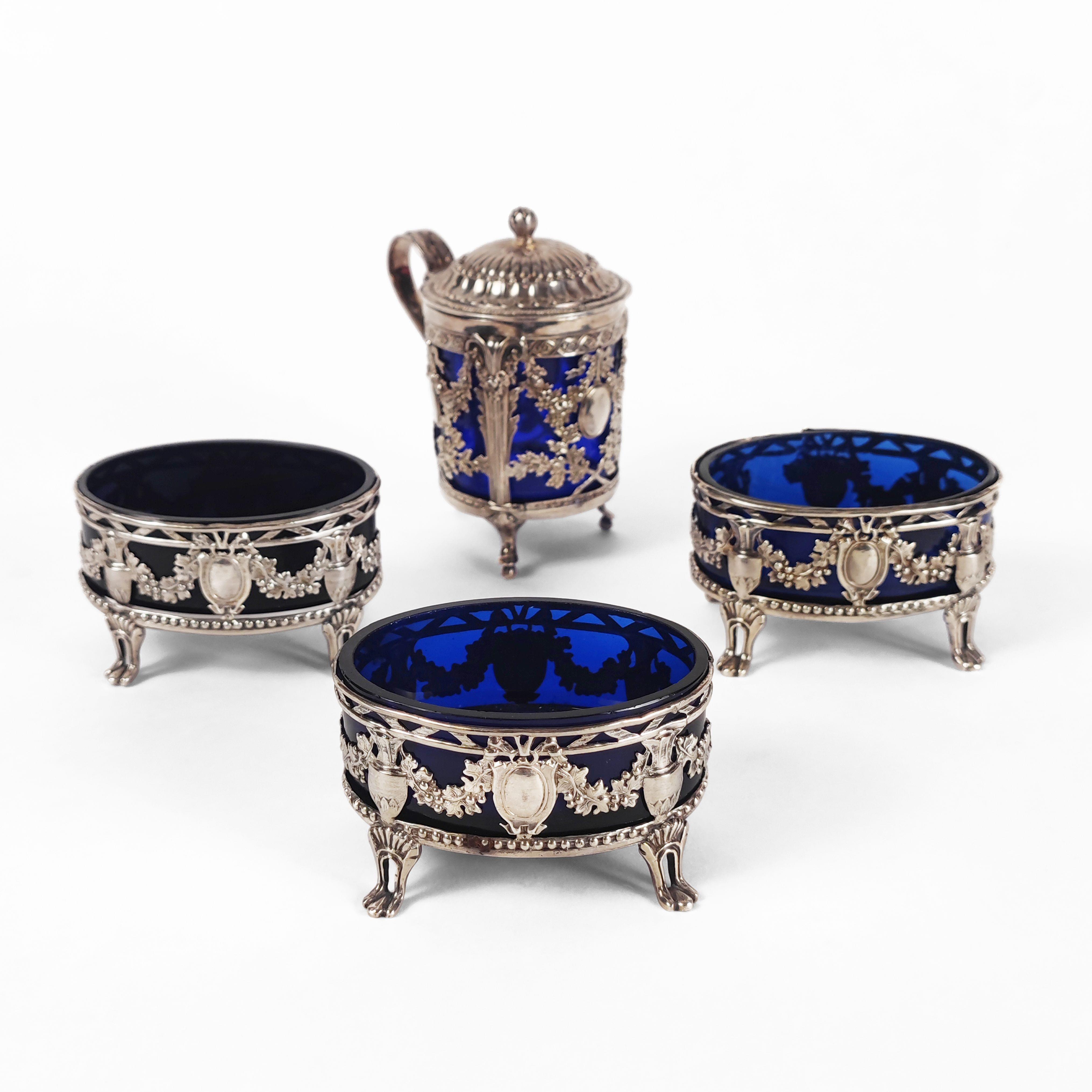 3921. Trois salerons et un moutardier, à décor néoclassique, d'époque et de style Louis XVI