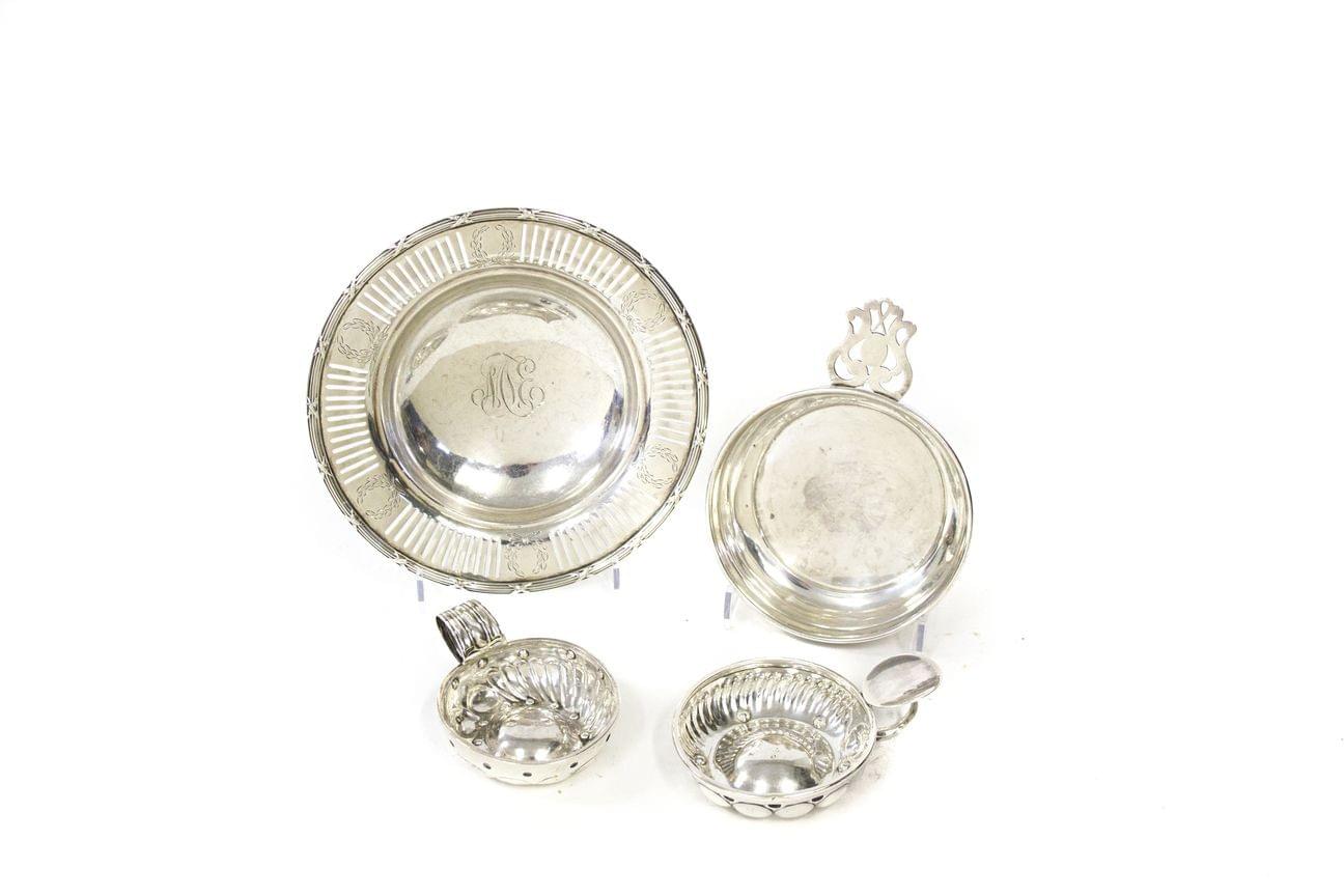 3427. Trois taste-vin et une coupelle à bordure ajourée
