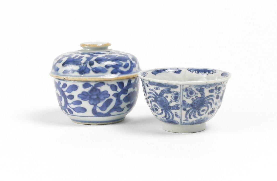 Porcelaine émaillée bleu blanc, D 7 et 8 cm