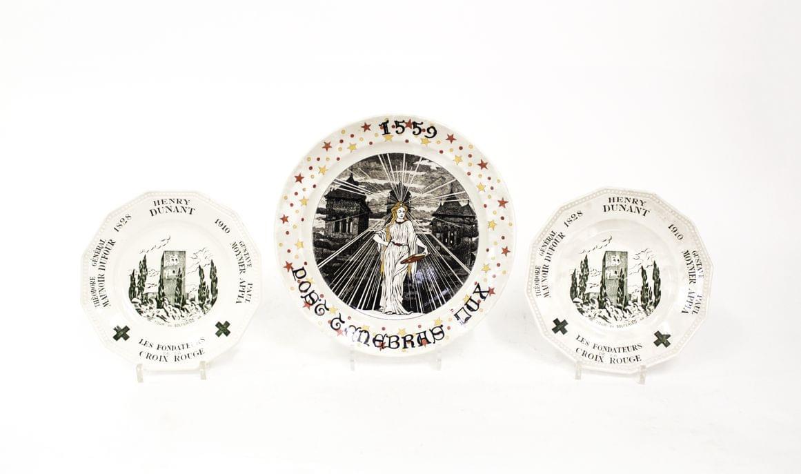 3645. Une assiette commémorative "Post tenebras lux 1959" et deux assiettes commémoratives de la Croix-Rouge, 1910