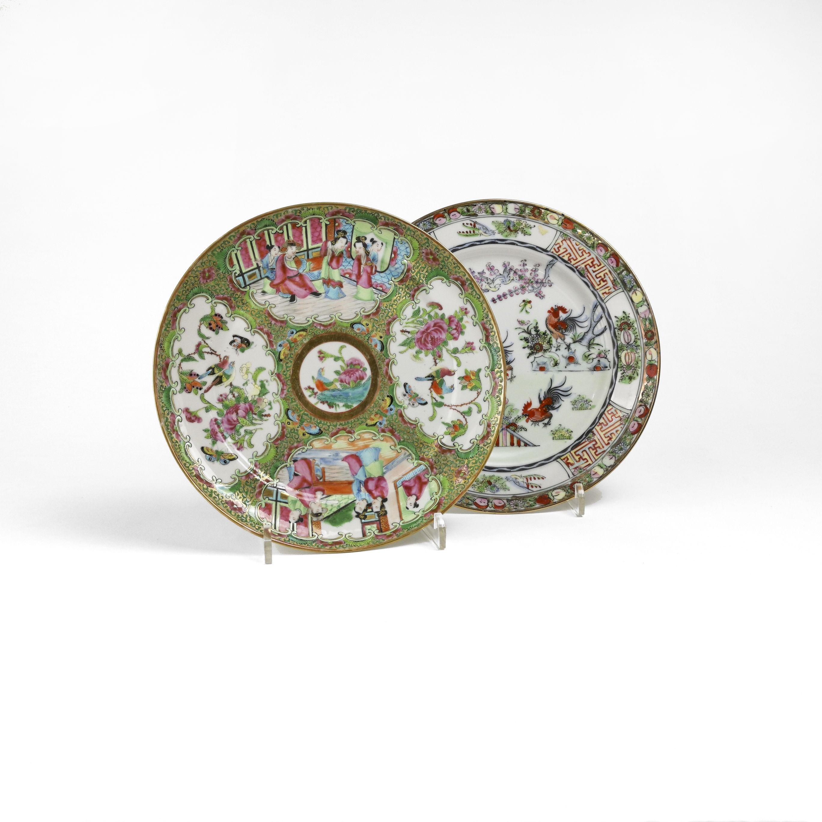 Porcelaine émaillée polychrome, D 25 cm. On joint une assiette à décor de coques, porcelaine émaillée polychrome, D 26 cm.