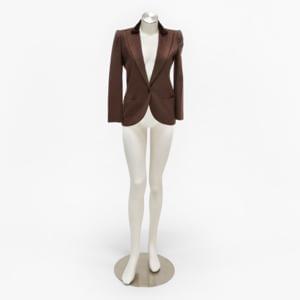 L'une en flanelle et surpiqûre en satin noir, intérieur en soie noire, fermeture croisée à quatre boutons; la deuxième en coton et lin bleu marine ; la troisième en laine et cachemire chocolat avec un col plissé en satin, fermeture un bouton. taille 6. Chemisier en soie et mousseline de soie beige à surpiqûre camel, taille 6