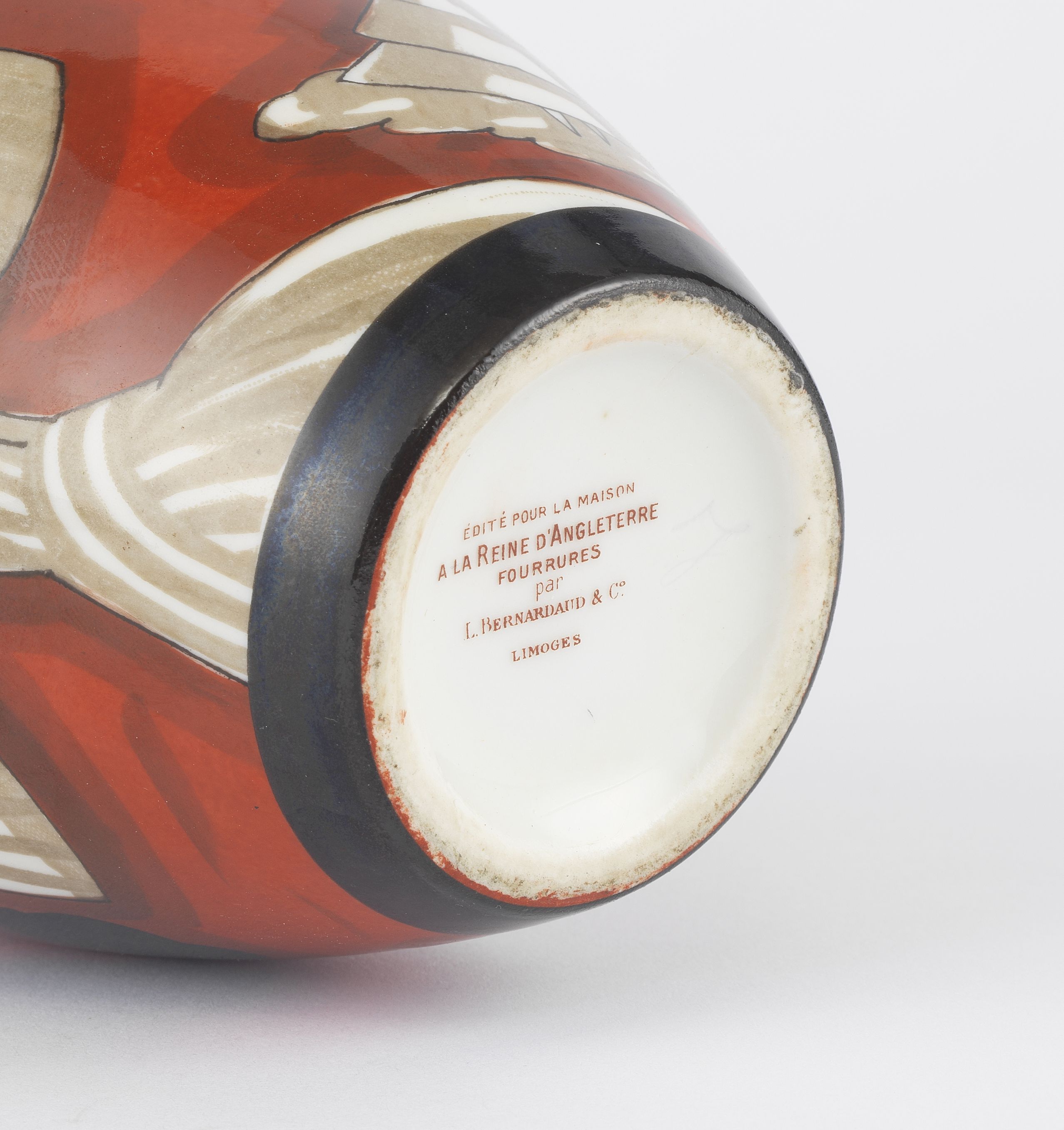 Porcelaine émaillée à décor d'élégantes sur fond rouge, H 14 cm. Provenance: Les Stern, une famille de collectionneurs.