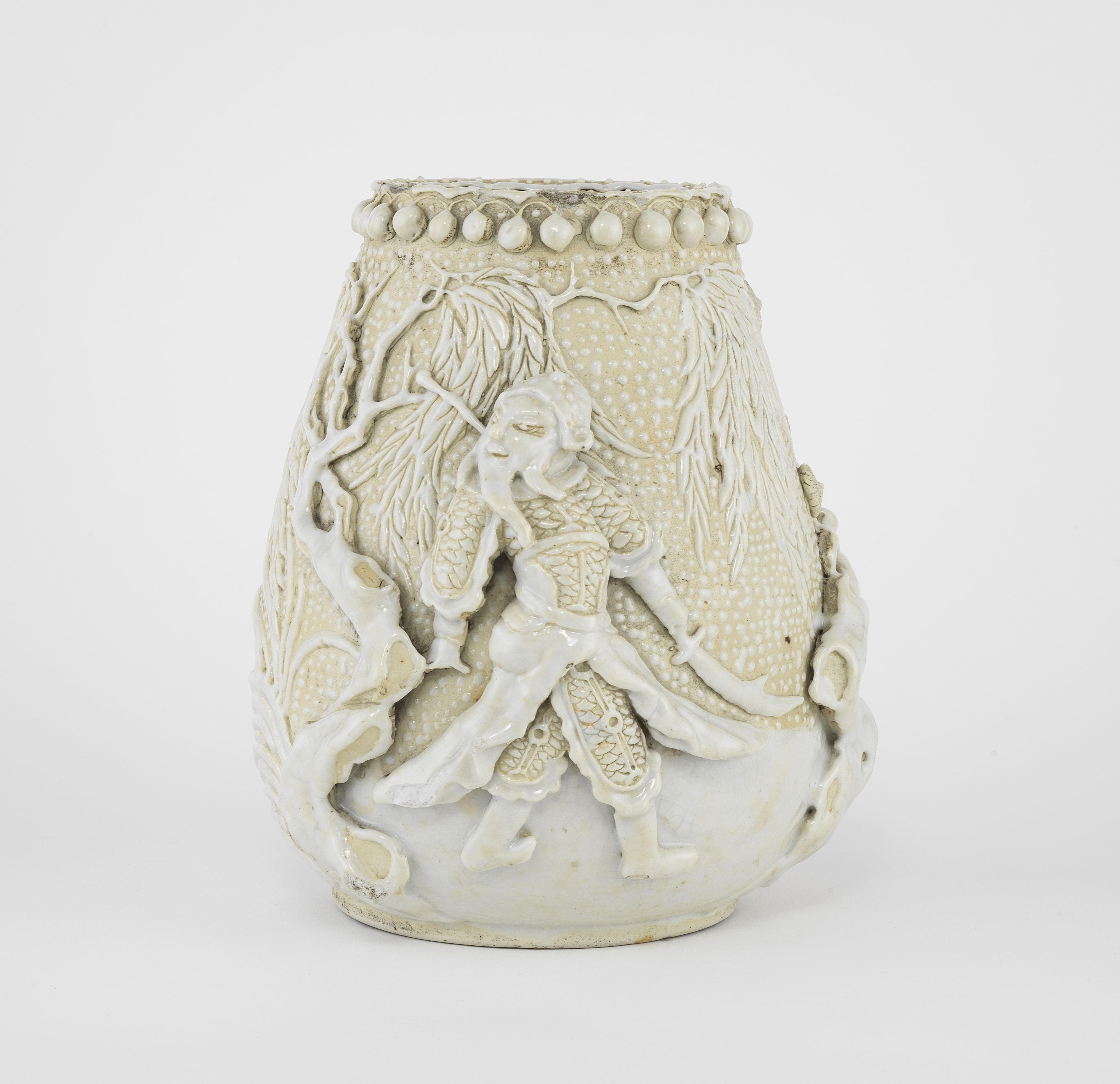 Céramique émaillée blanche à décor d'un guerrier et d'arbres en relief, H 25 cm