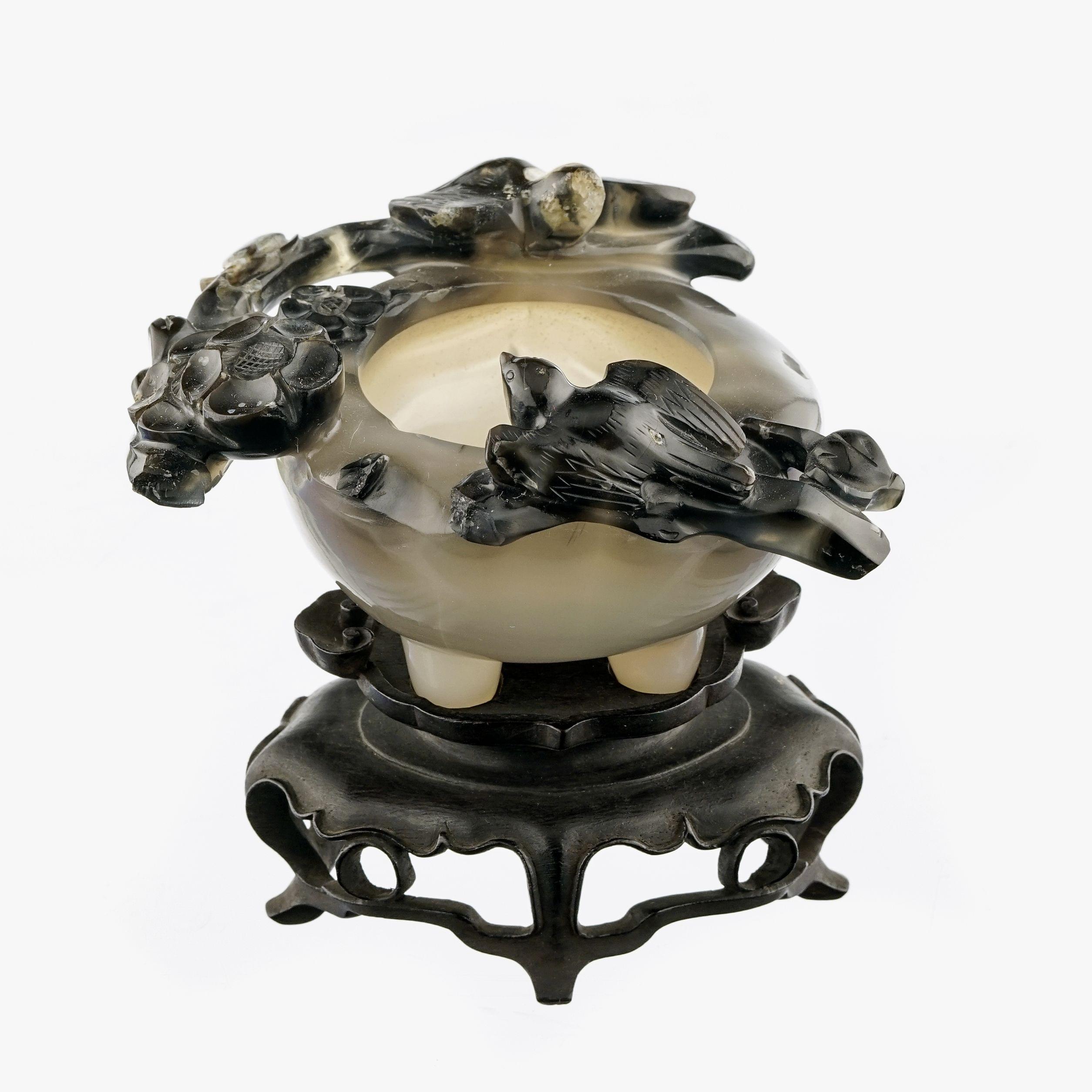 Agathe sculptée d'oiseaux et fleurs de prunier, H 6 cm