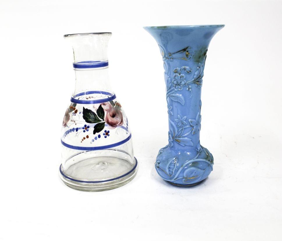 3162. Vase en opaline turquoise et vase à décor émaillé de fleurs