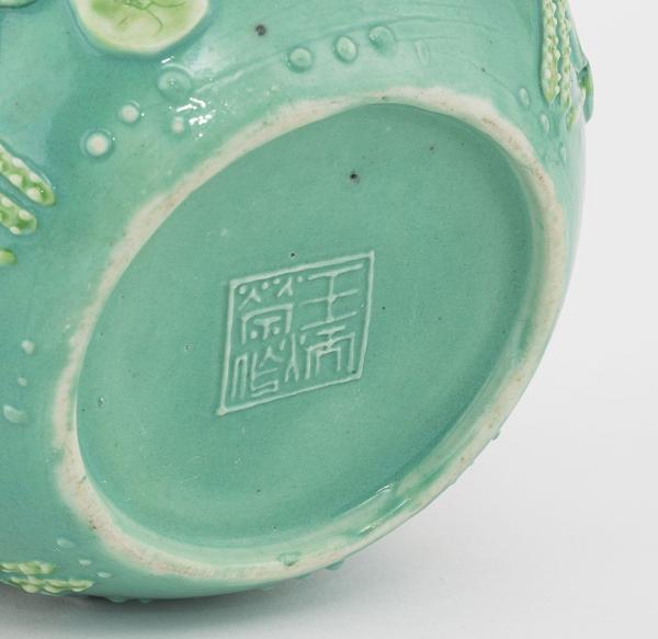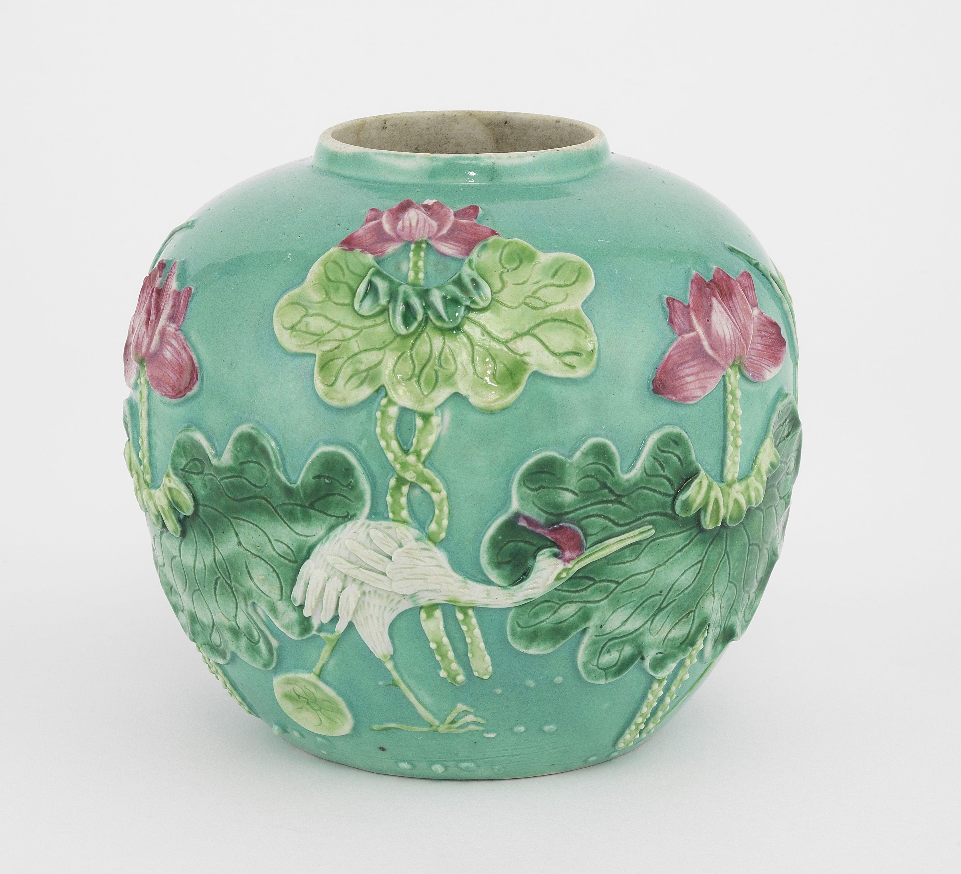 Porcelaine émaillée vert, rose et turquoise à décor en léger relief d'une grue et de nénuphars, H 11 cm