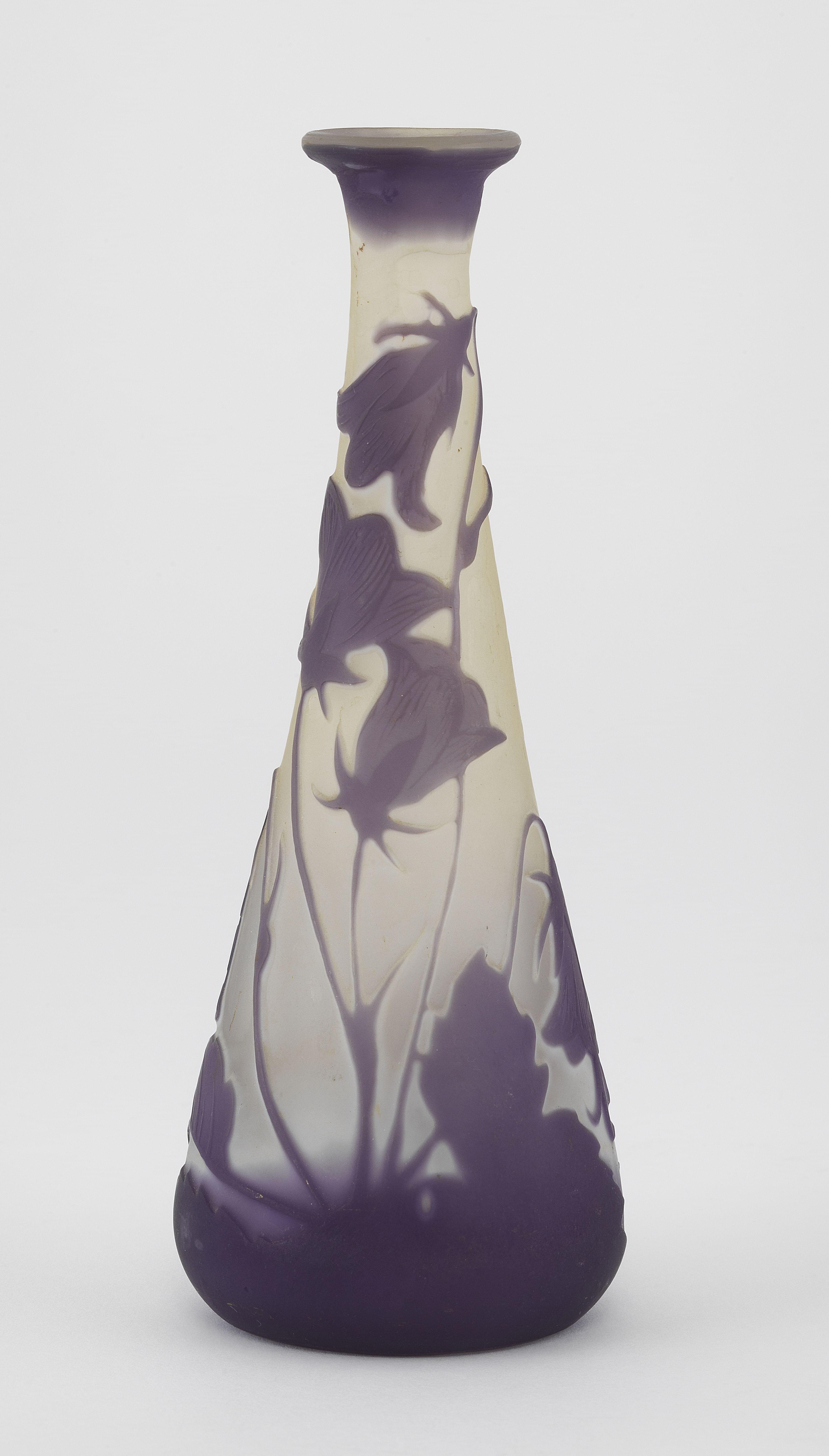 Verre multicouche dégagé à l'acide à décors de campanules bleues sur fond blanc, H 13 cm