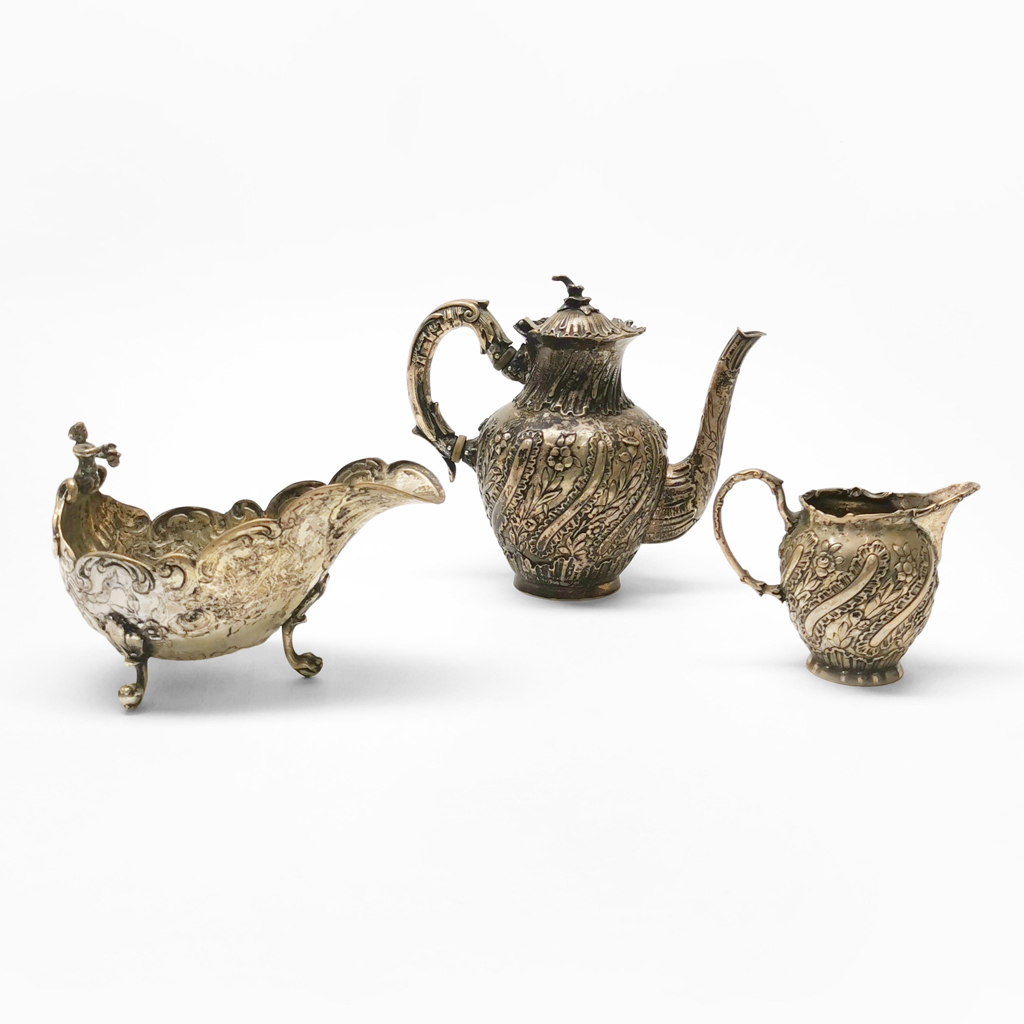 3853. Verseuse, pot à lait et saucière à motif de fleurs et volutes