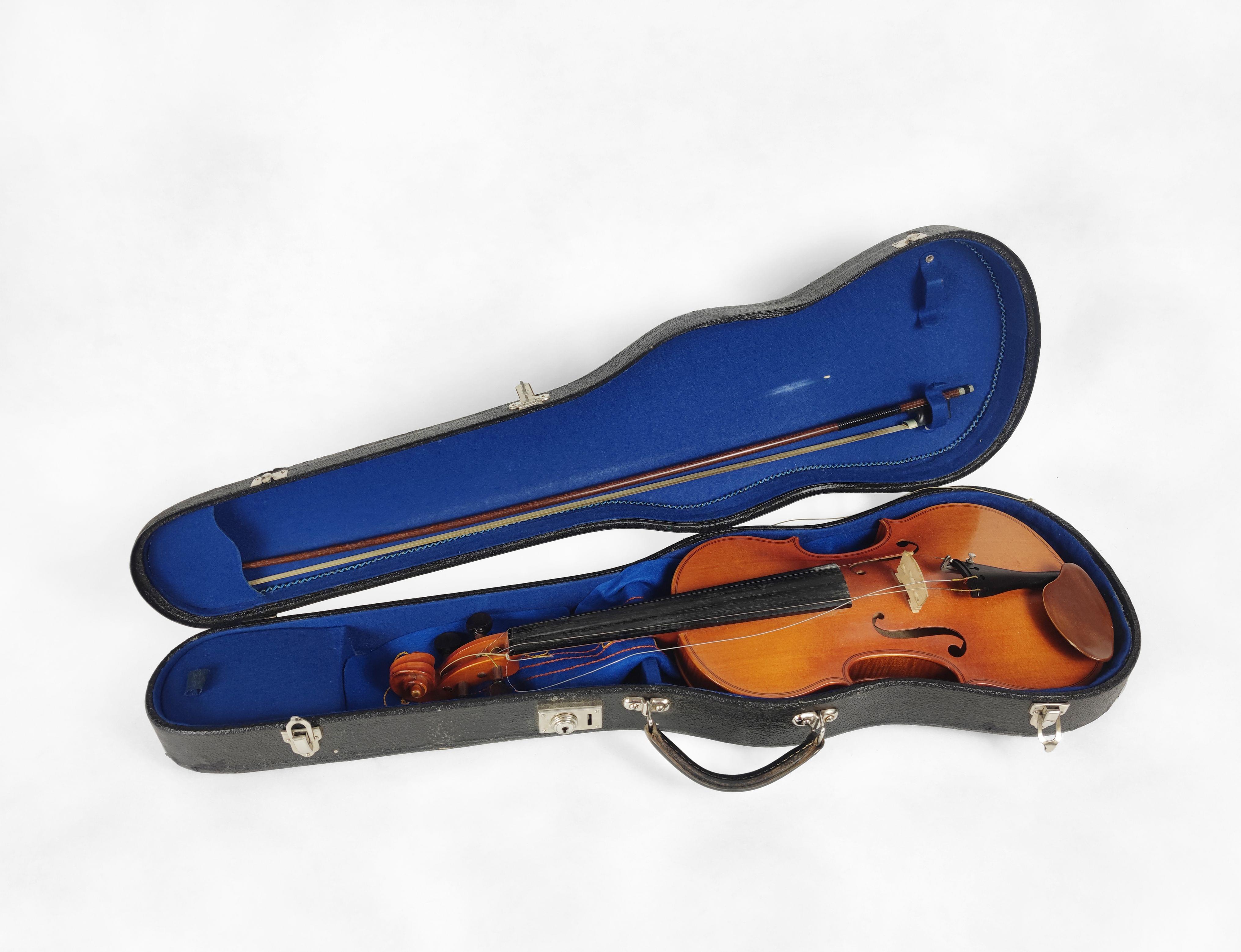 Etiquette du fabricant portant le n°395 et datée 1959, L 59 cm. On joint un archet.
