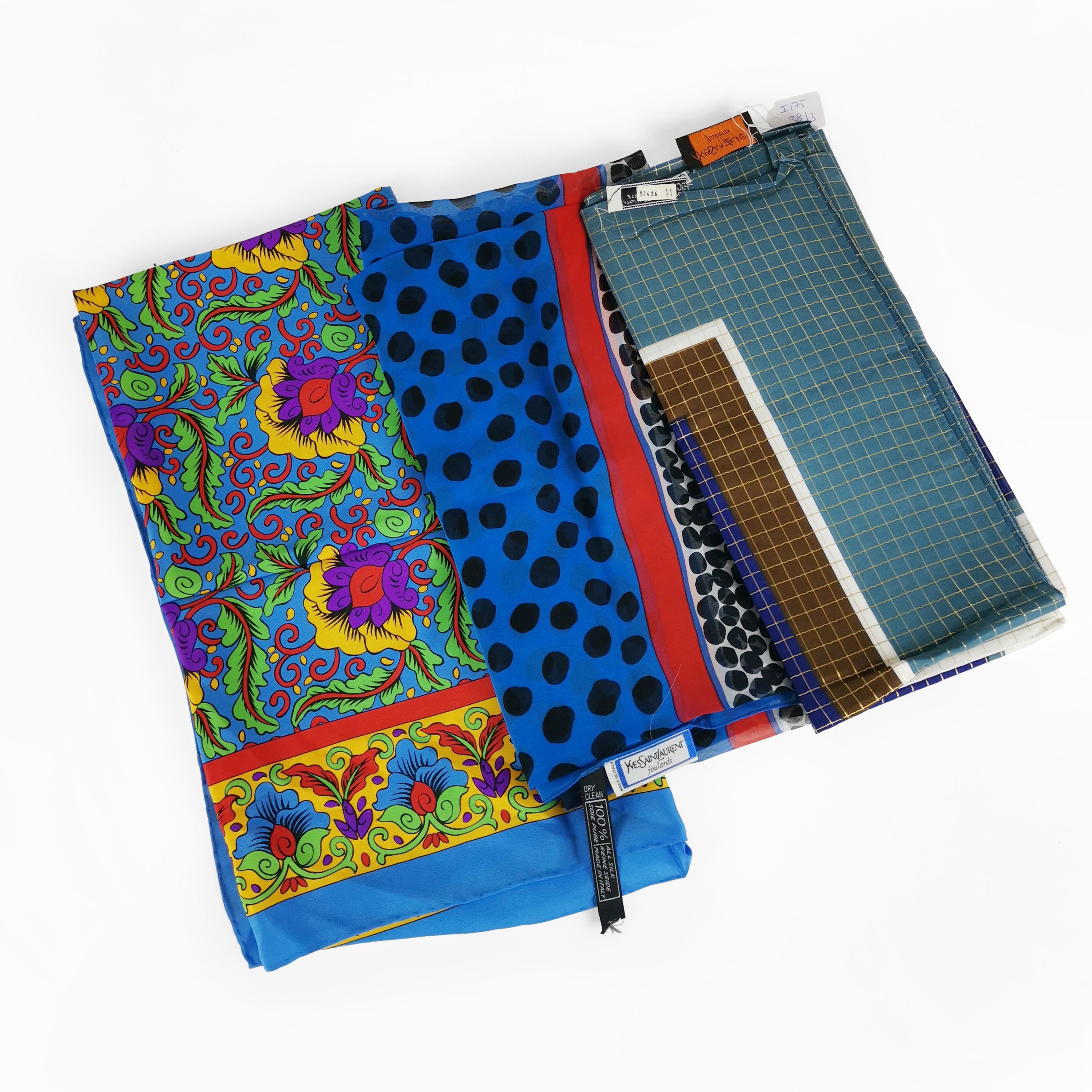 Le premier à décor de fleurs multicolores sur fond bleu ; le deuxième à décor de points noirs sur fond bleu et blanc ; le troisième à décor de carreaux multicolores et fils dorés, soie, 84x84, 130x130 et 85x85 cm. Provenance : collection Marisa Perret-Rezzonico