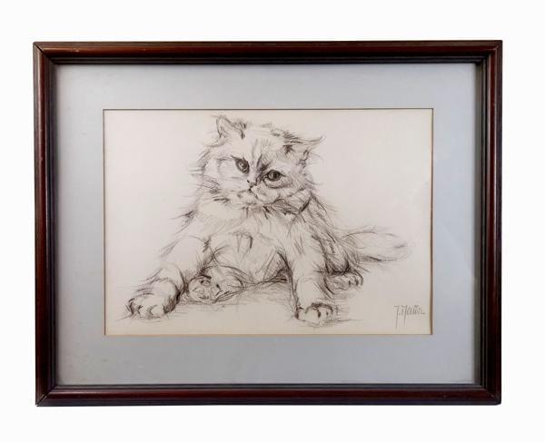 Jeune chat persan, fusain sur papier, signé, 29x42 cm