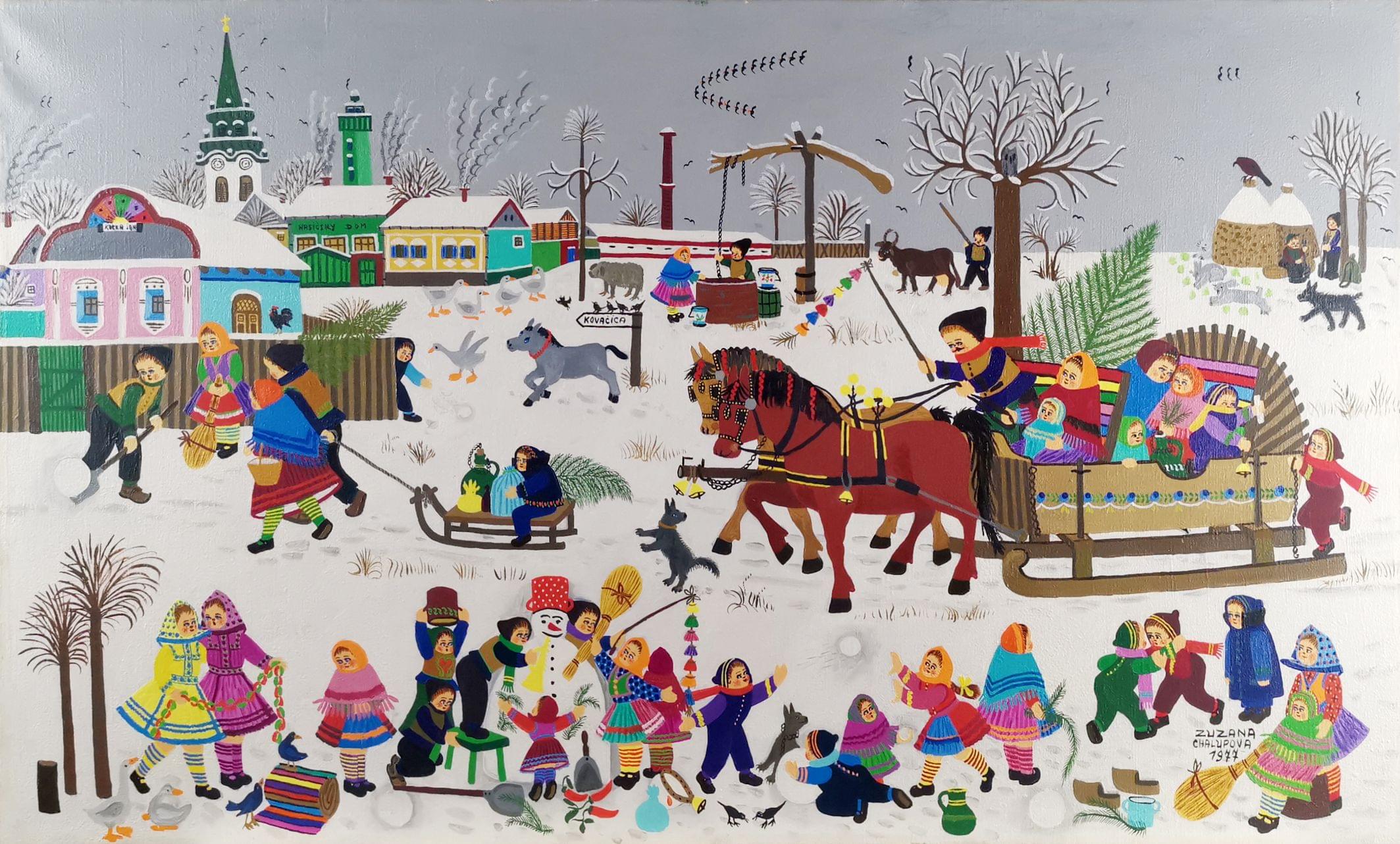 Village en fête, huile sur toile, signée et datée 1977, 60x100 cm