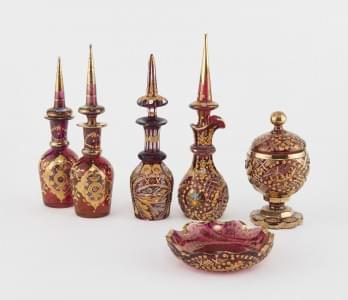 4962. Quatre carafes, une bonbonnière et une soucoupe, Bohème, XIXe po...