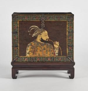 Papier maché laqué et peint à décor de scènes de palais et scène...