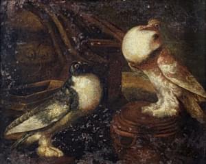 Les Pigeons, huile sur toile, mauvais état, 41x52 cm