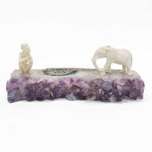 Améthyste polie surmontée d'un éléphant et d'une figurine en ivo...