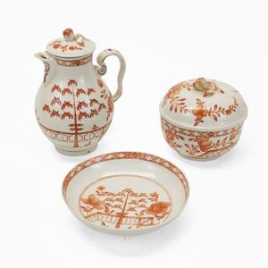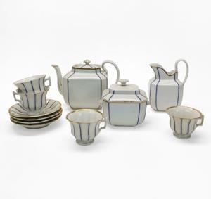 Porcelaine, comprenant: 6 assiettes, 10 tasses, théière, sucrier