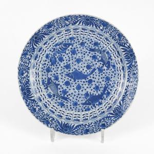Faïence émaillée bleu sur fond blanc, D 30 cm