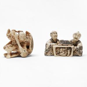 4750. Deux netsukes figurant un groupe avec personnages et animaux, Ja...