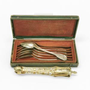 3766. Suite de 6 cuillères à thé et pince à sucre armoriées