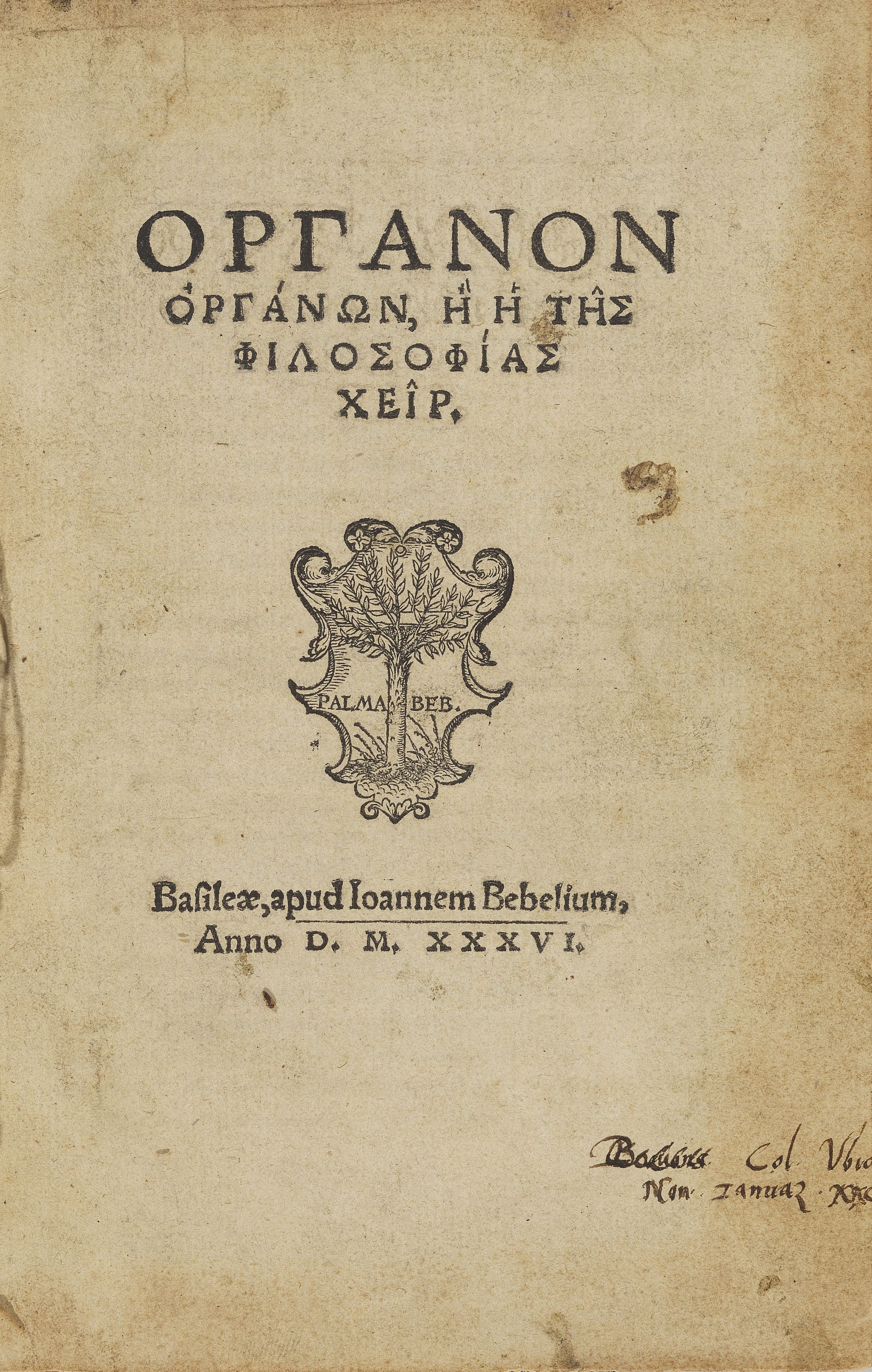3000. ARISTOTE. Organon… Philosophiae. Bâle, Johann Beber, 1536