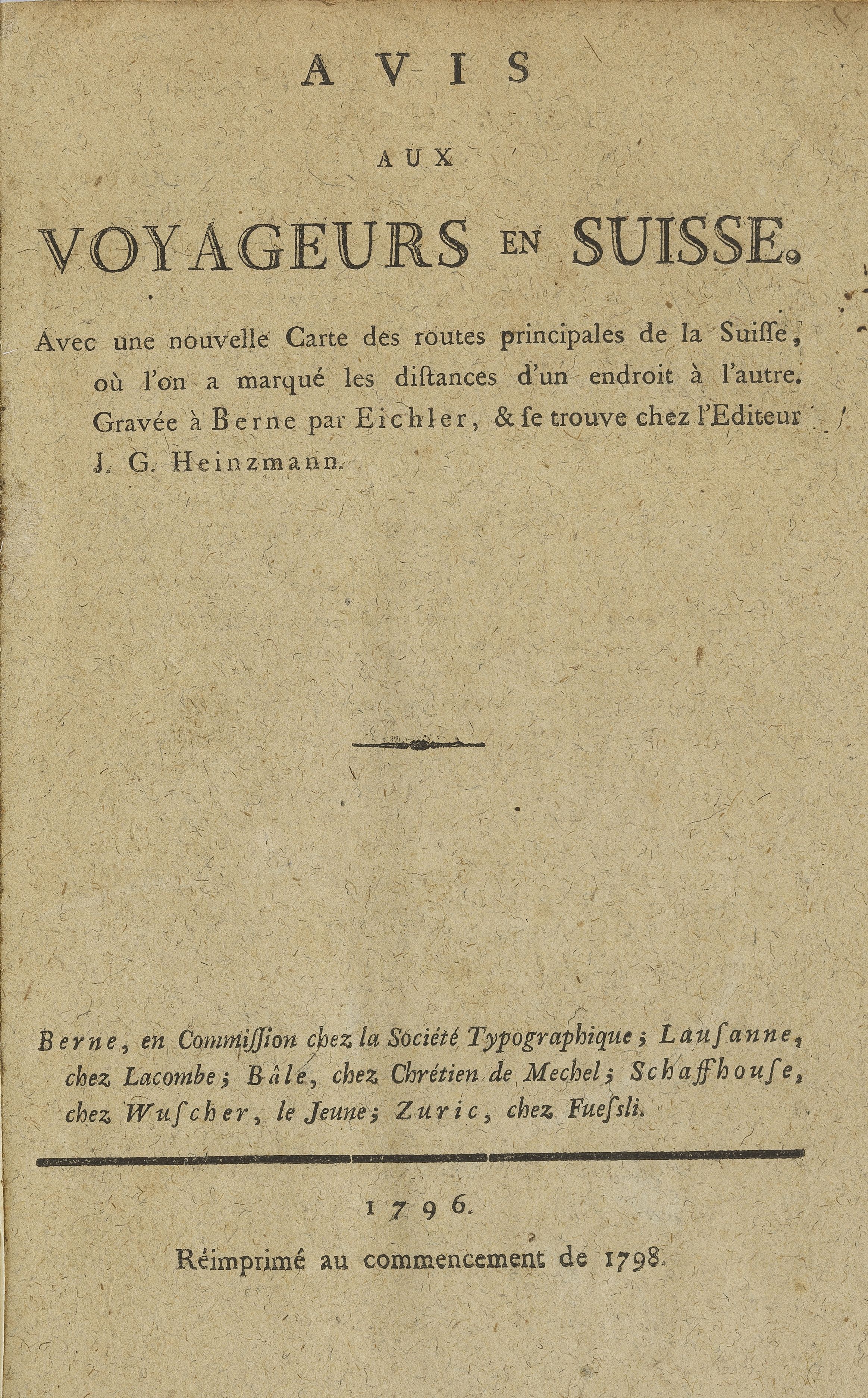 3027. HELVETICA. EICHLER : Avis aux Voyageurs en Suisse. Berne, Lausan...
