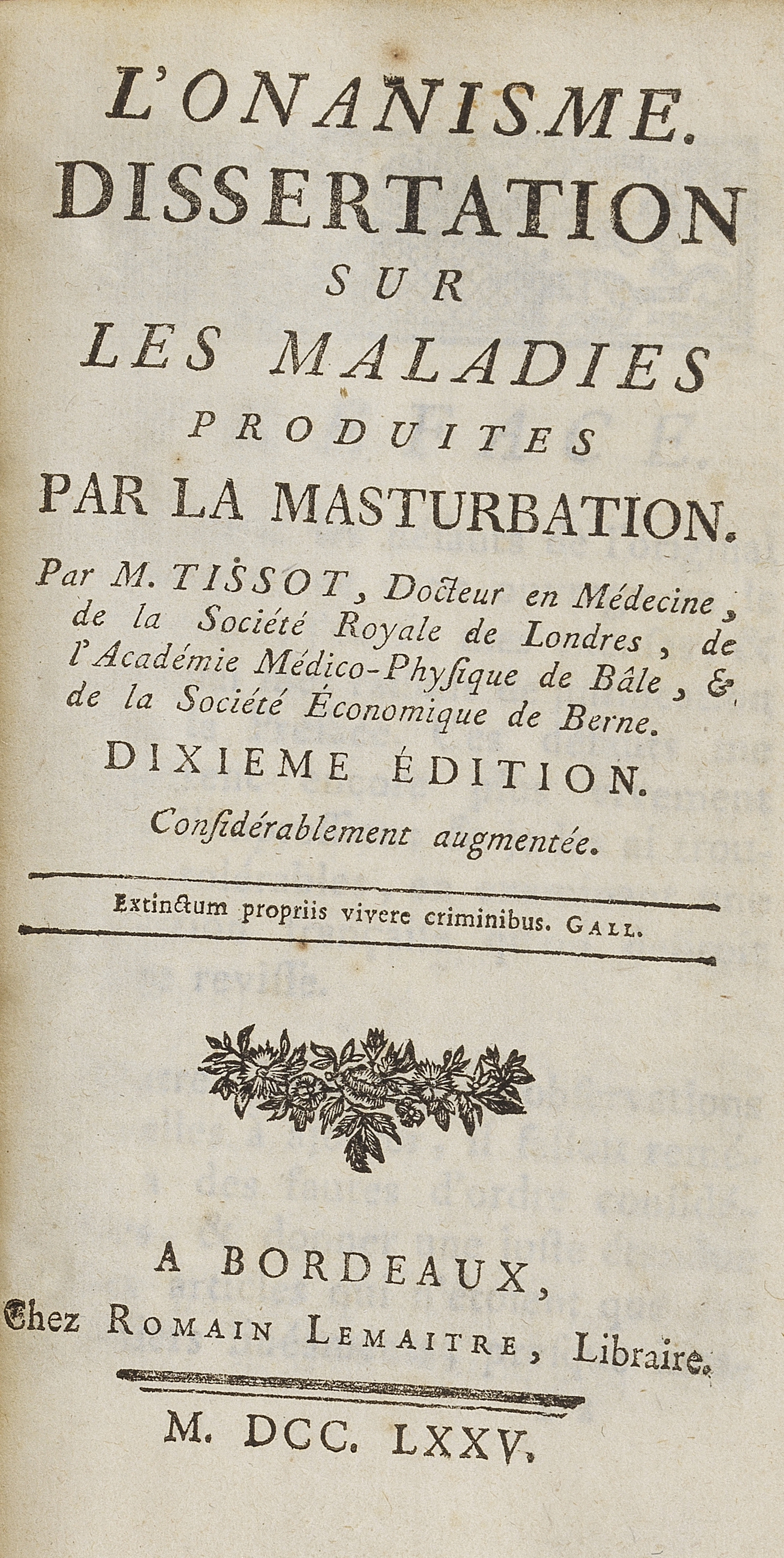 3019. TISSOT (Samuel Auguste) : L’Onanisme, Dissertation Sur Les Malad...