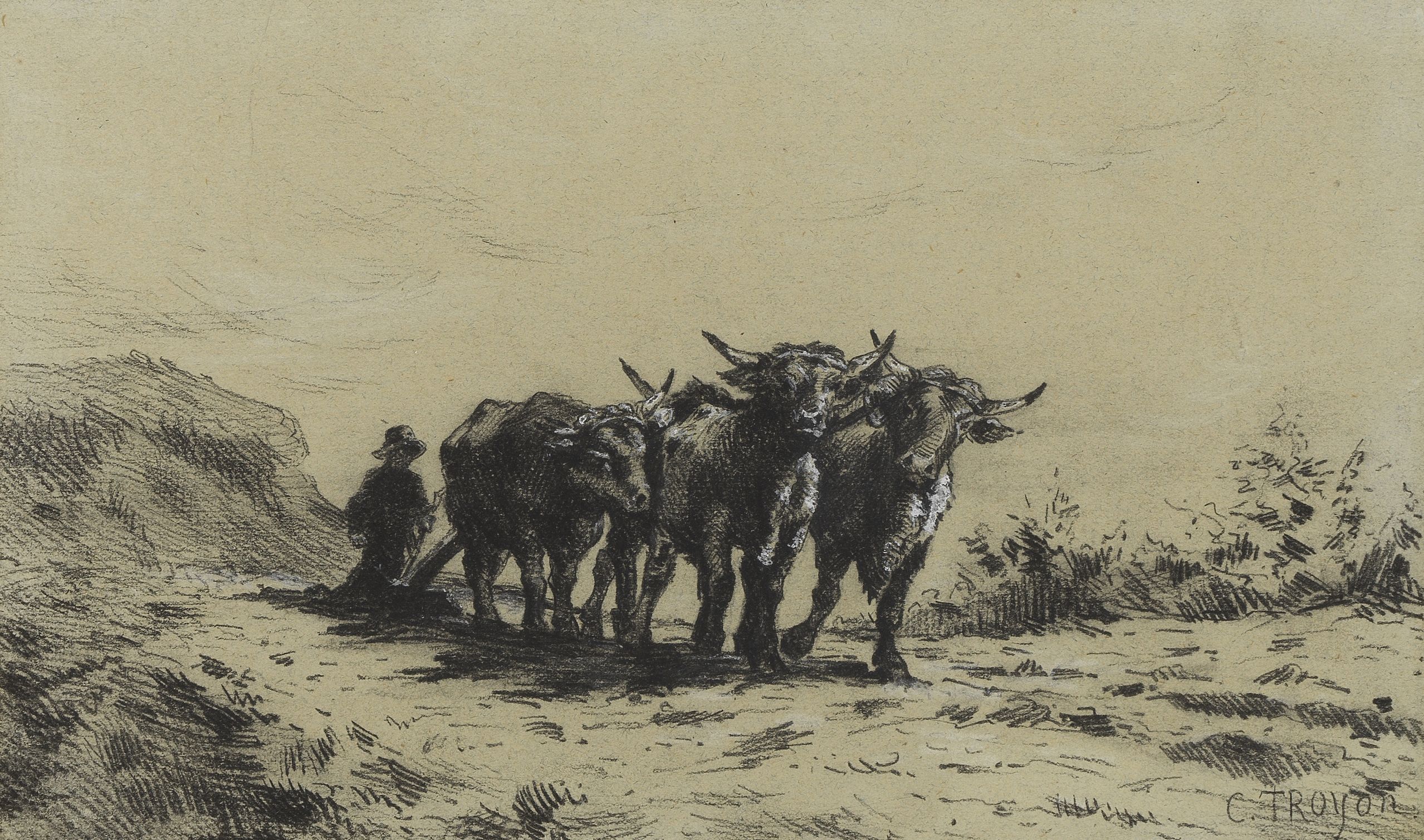 Charrue, pastel et craie, signé, 11,5x19,5 cm