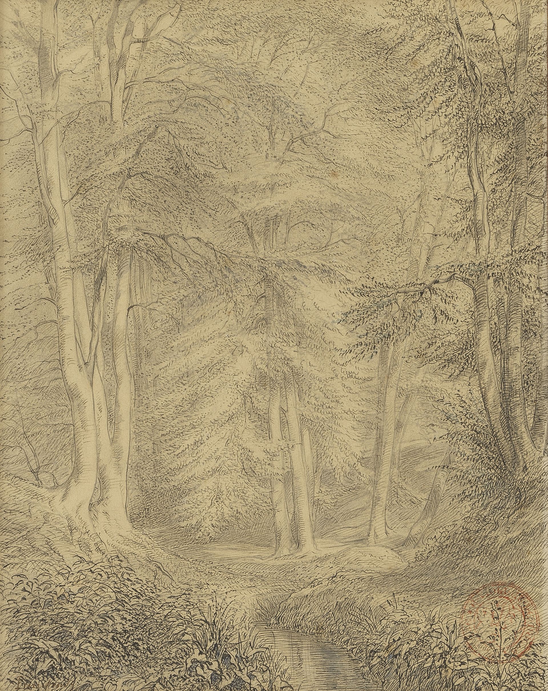 Forêt, mine de plomb, signée et datée avril 71, cachet rouge, 25...