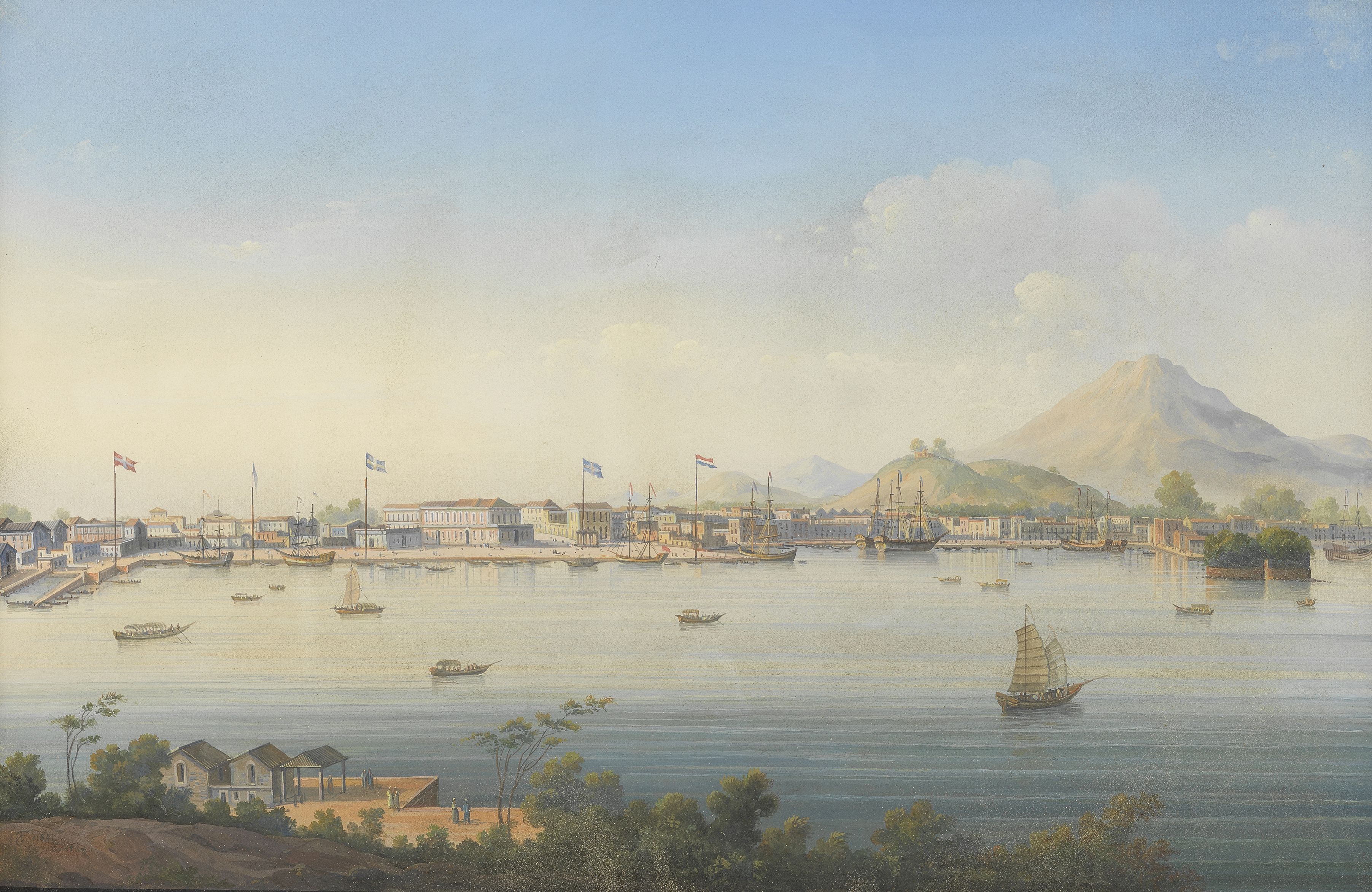 Vue du port de Canton, gouache sur papier, située et datée 1841,...
