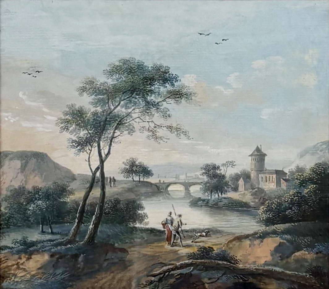Paysage animé, aquarelle sur papier, 15x15 cm. Provenance collec...
