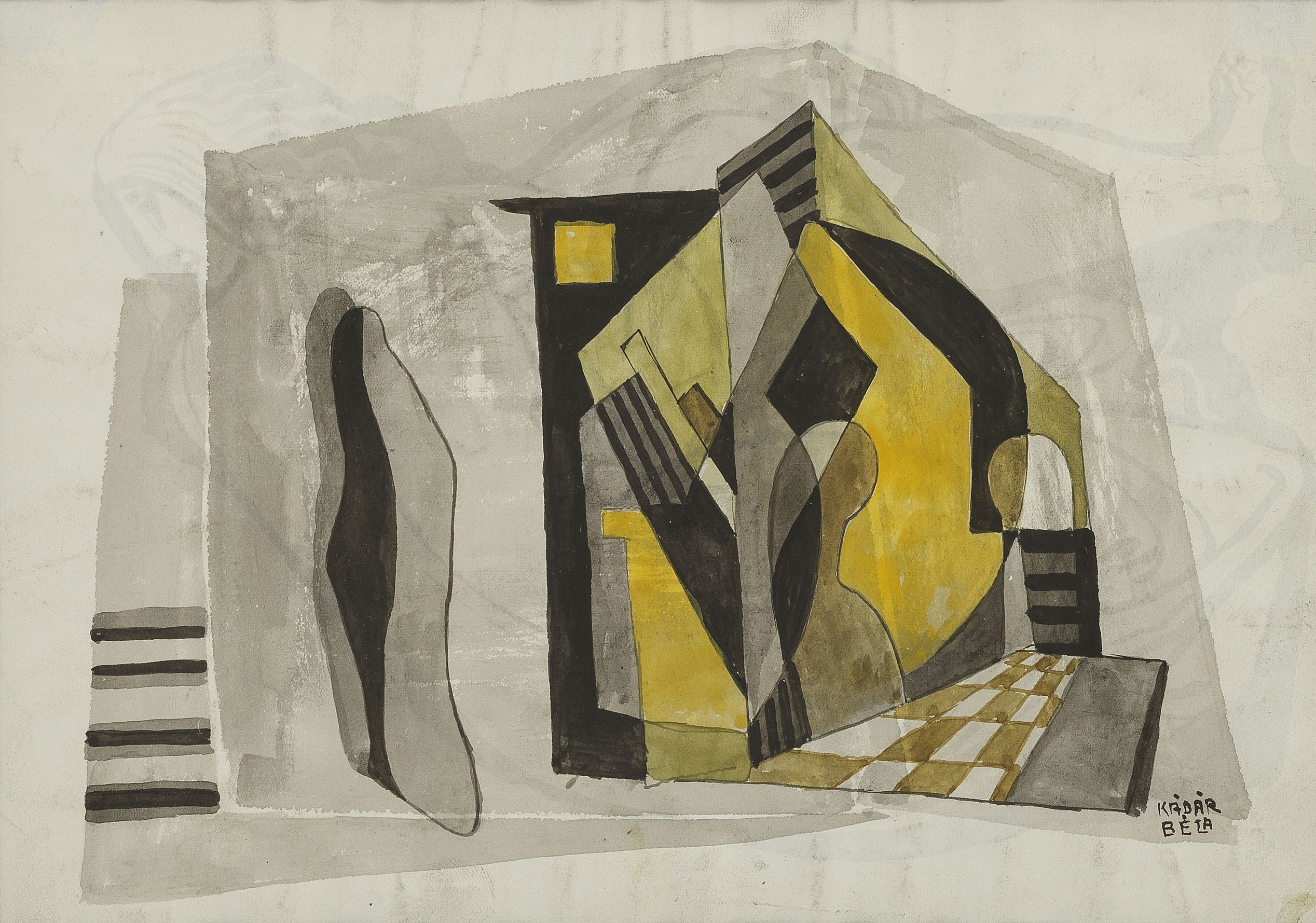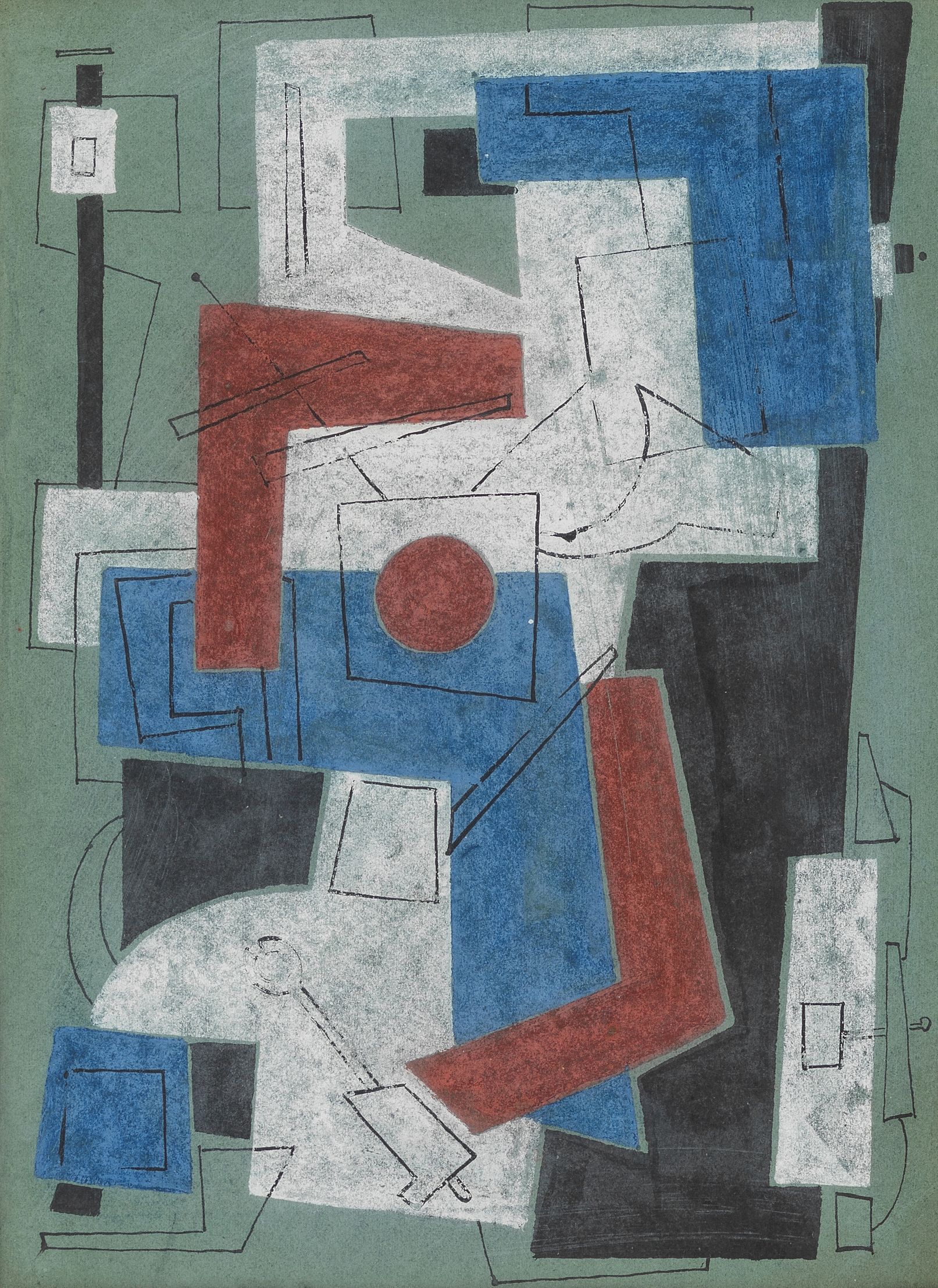 Composition cubiste abstraite, gouache sur papier vert, monogram...