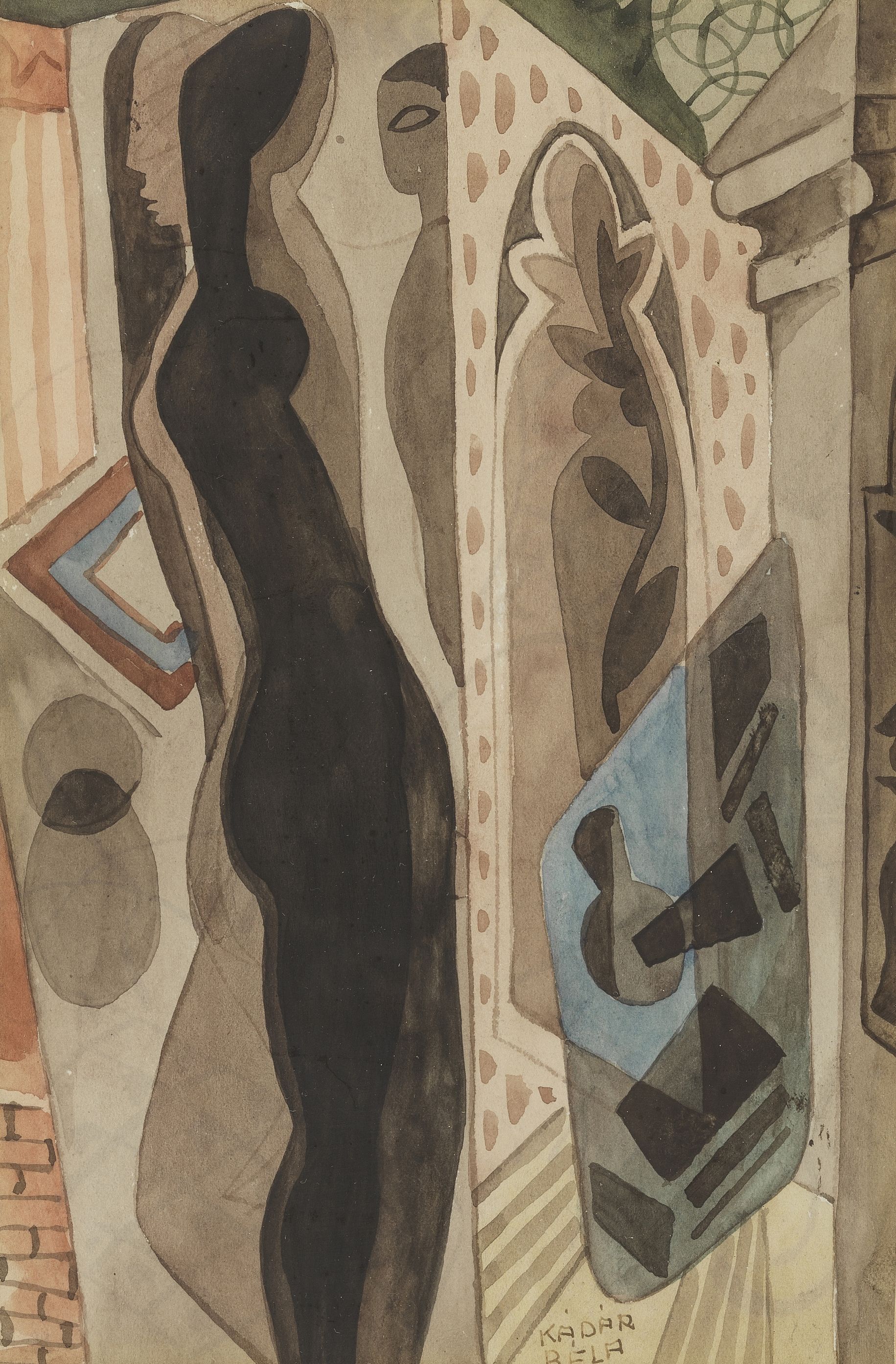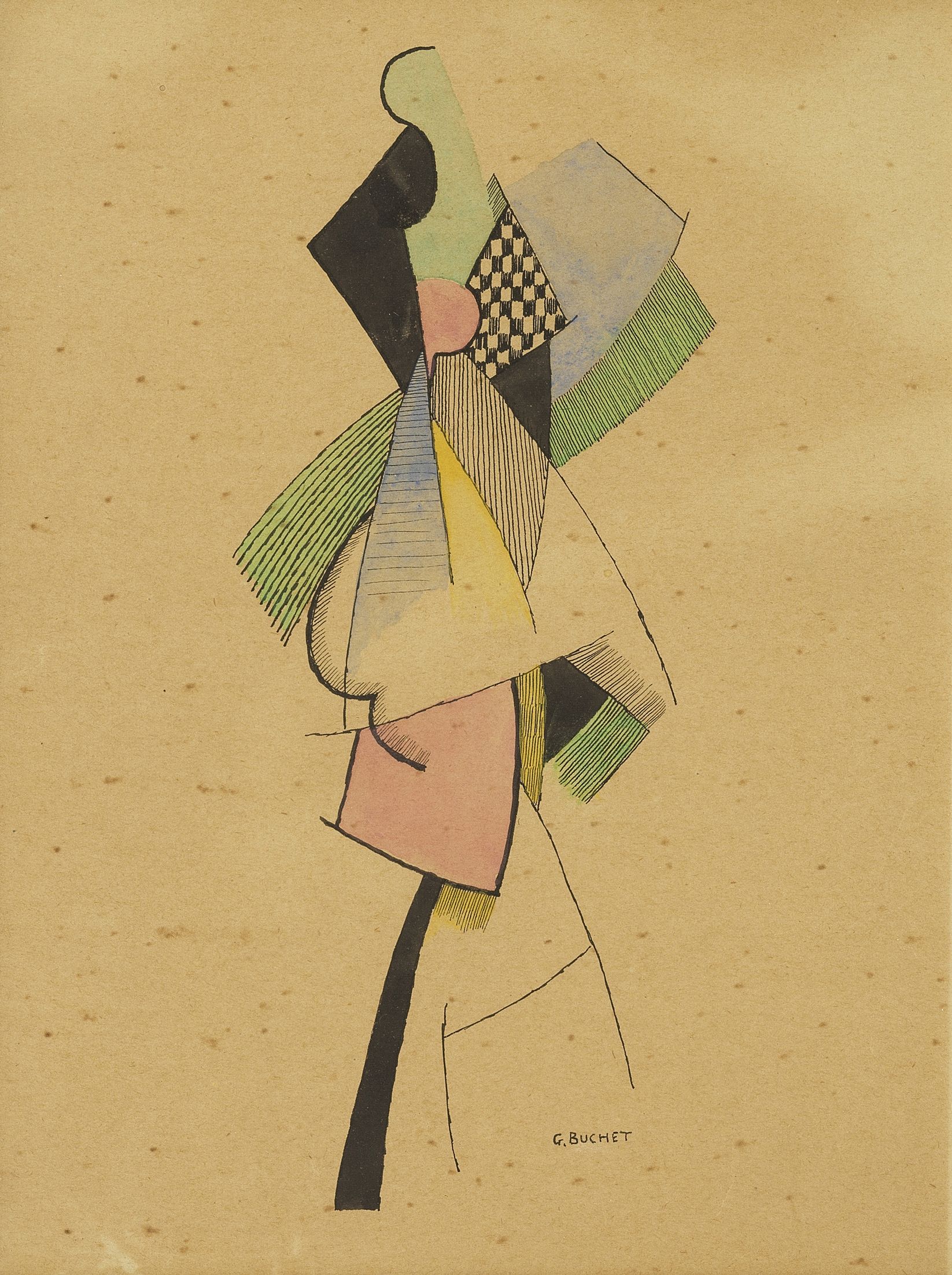 Silhouette dans un style cubiste, aquarelle, signée, 20,5x13,5 c...