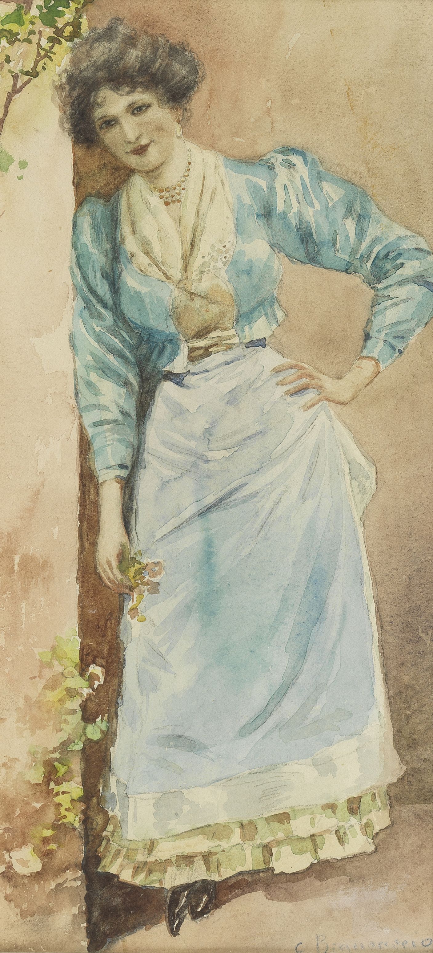 Jeune femme italienne adossée au mur, aquarelle sur papier, sign...