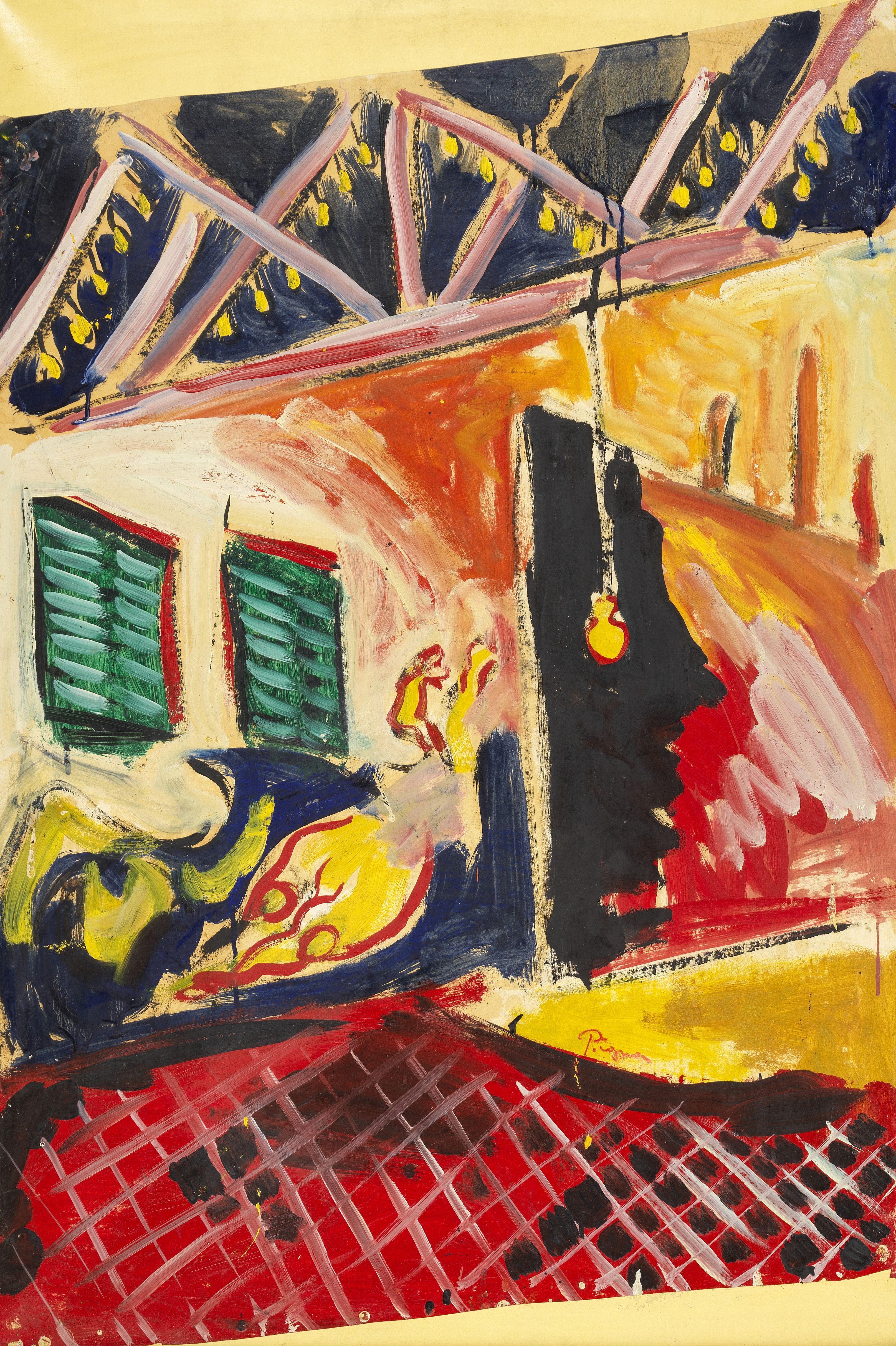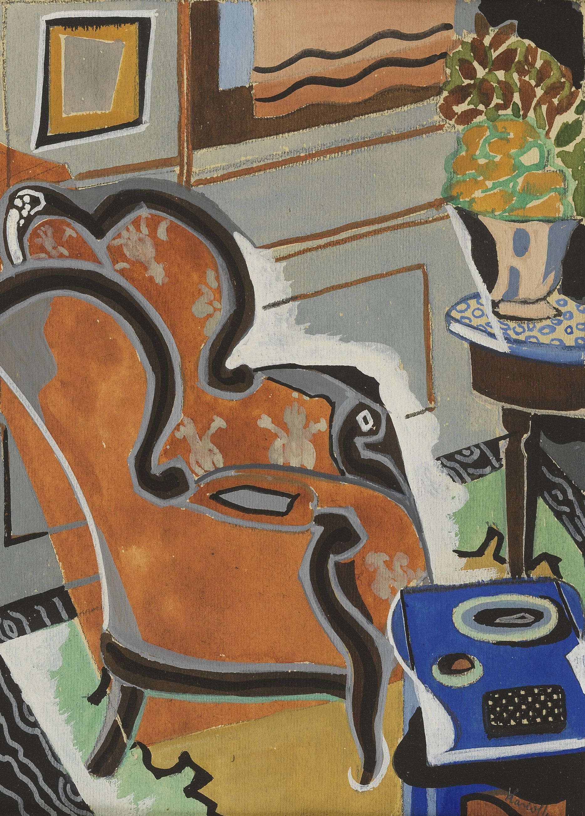 Composition au fauteuil orange, gouache sur papier, signée, 18x1...