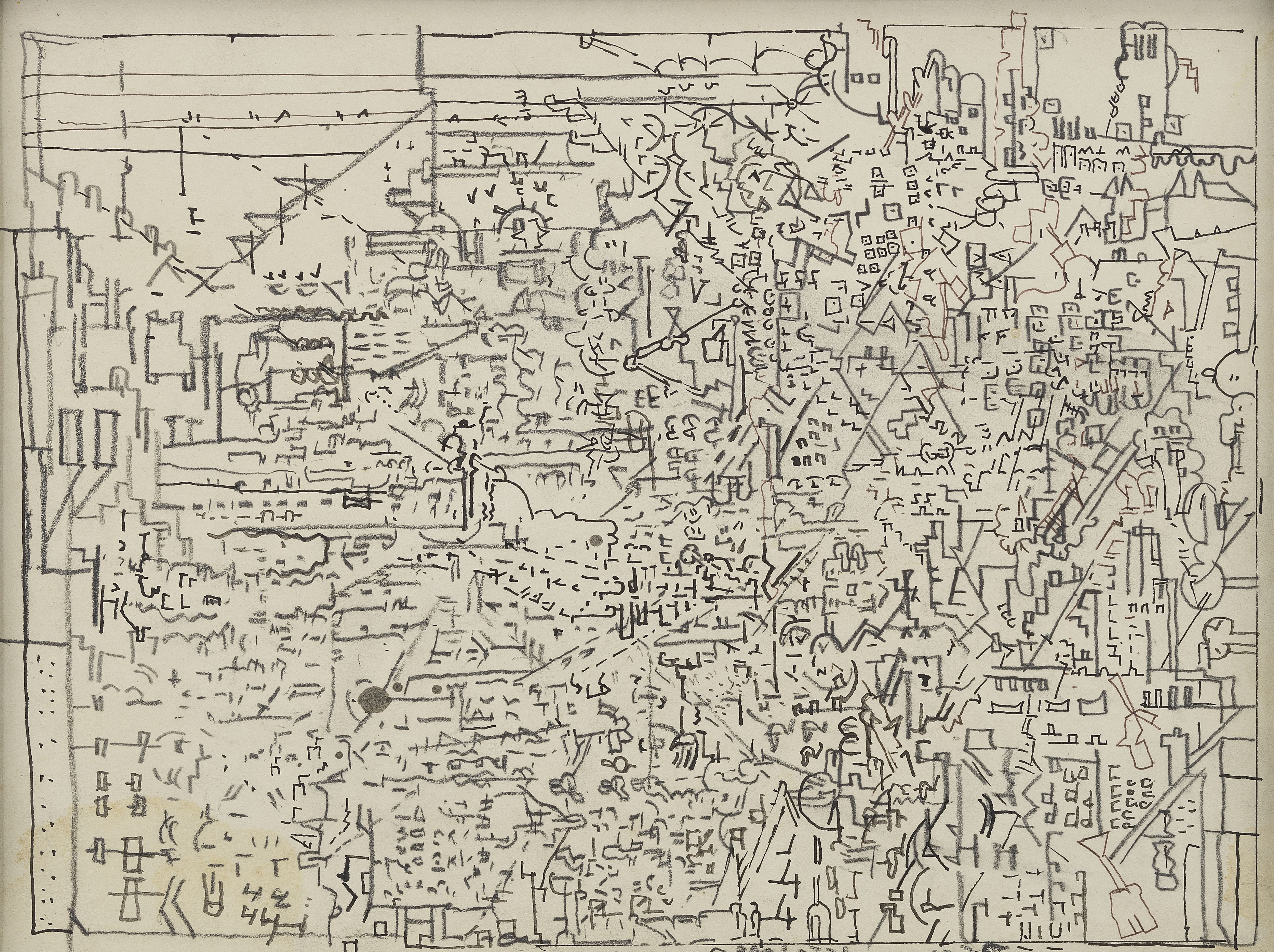 Composition à la maison penchée, encre et crayon sur papier, sig...