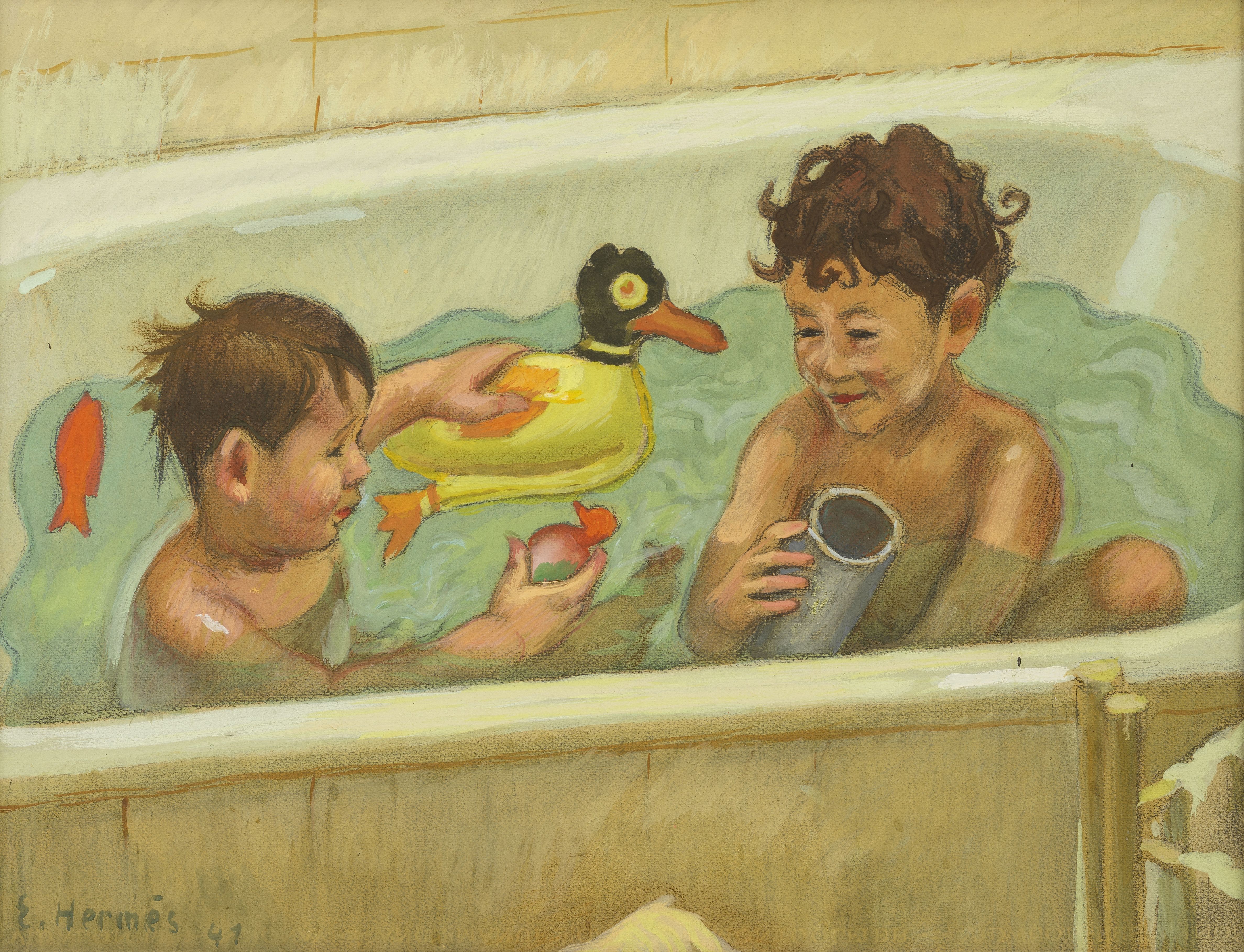 Enfants jouant dans le bain, pastel sur papier, signé et daté 41...