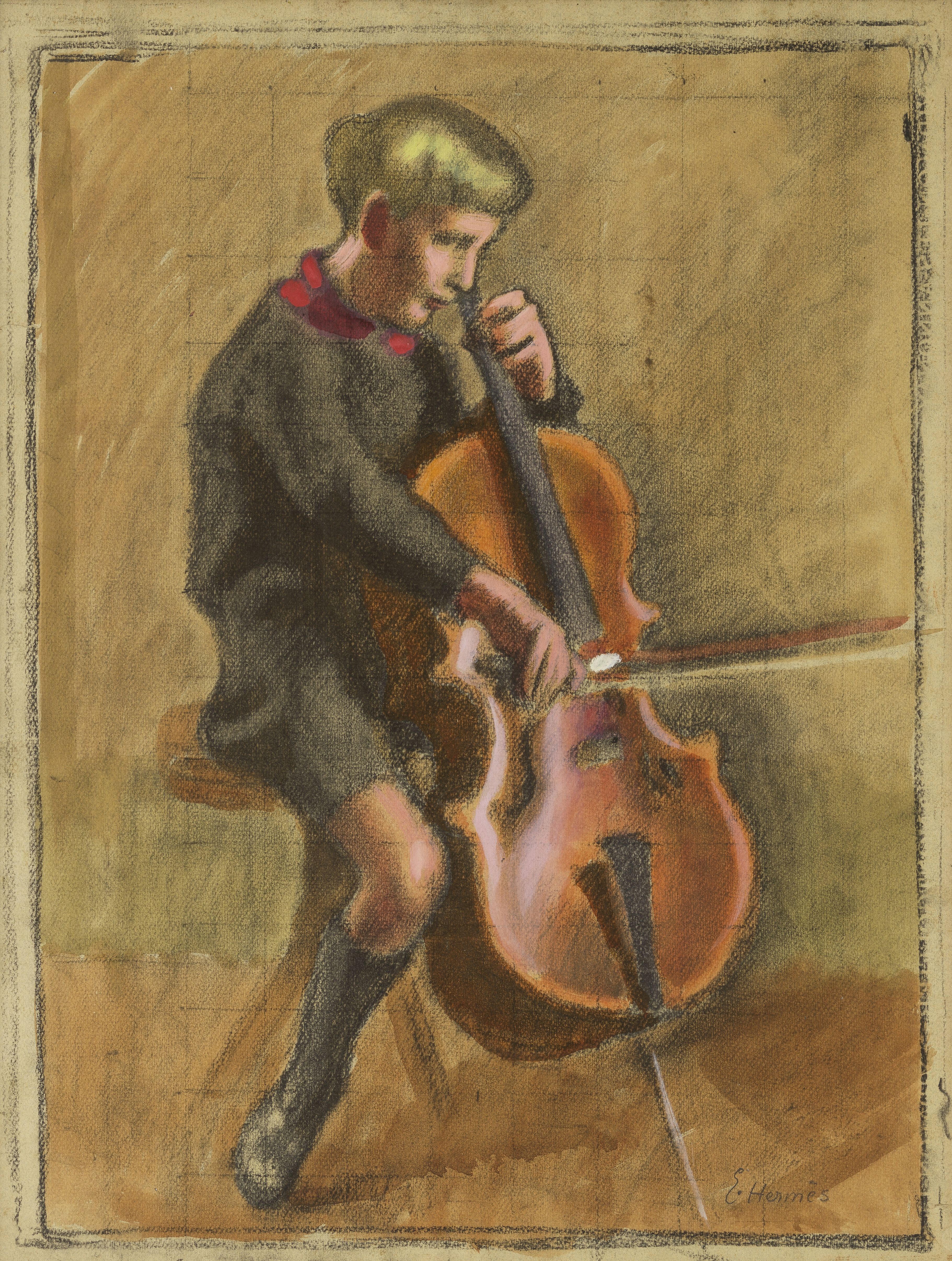 Luc jouant du violoncelle, fusain et gouache sur papier, 61x46 c...