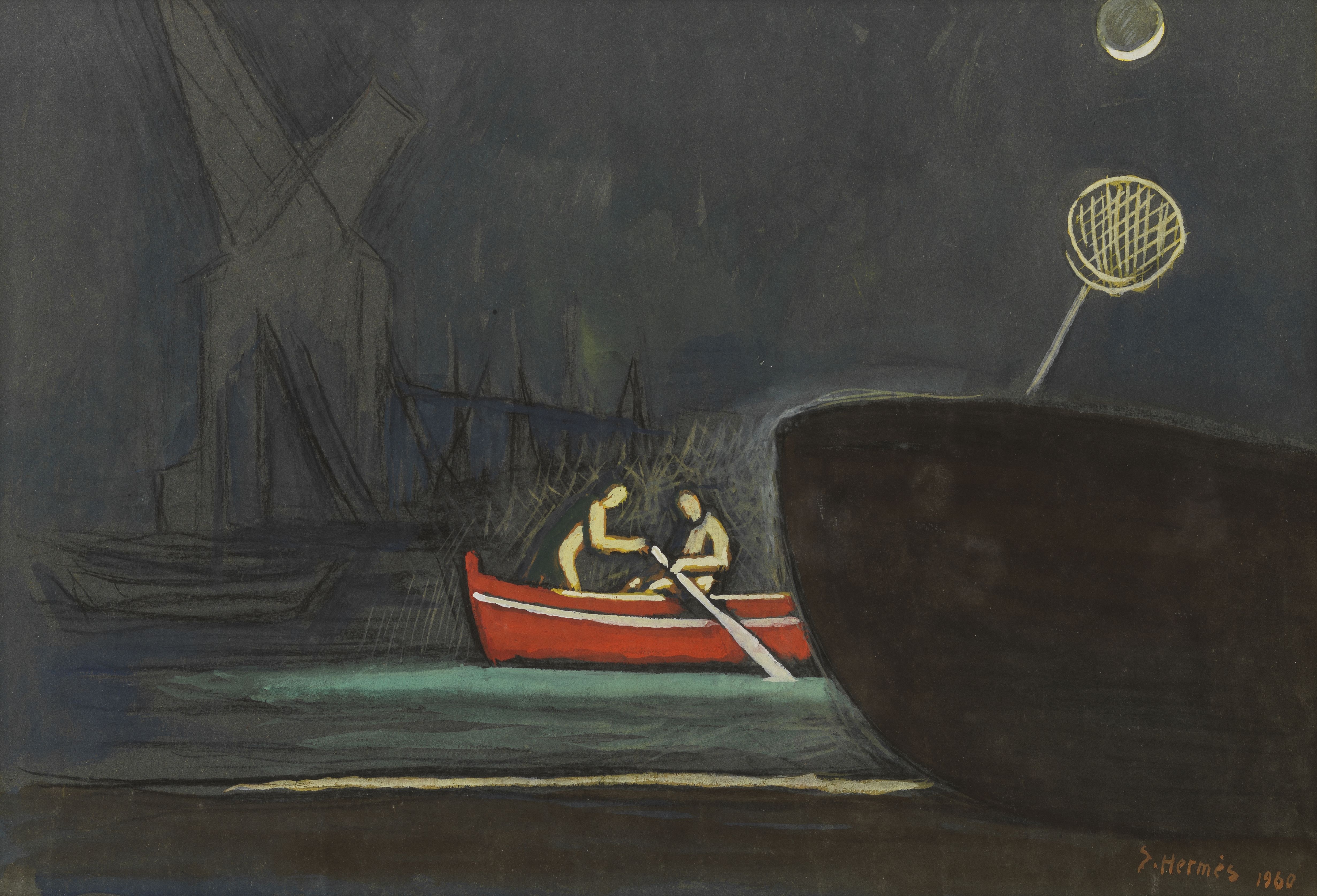 Barque au clair de lune, fusain et gouache sur papier, signé et...