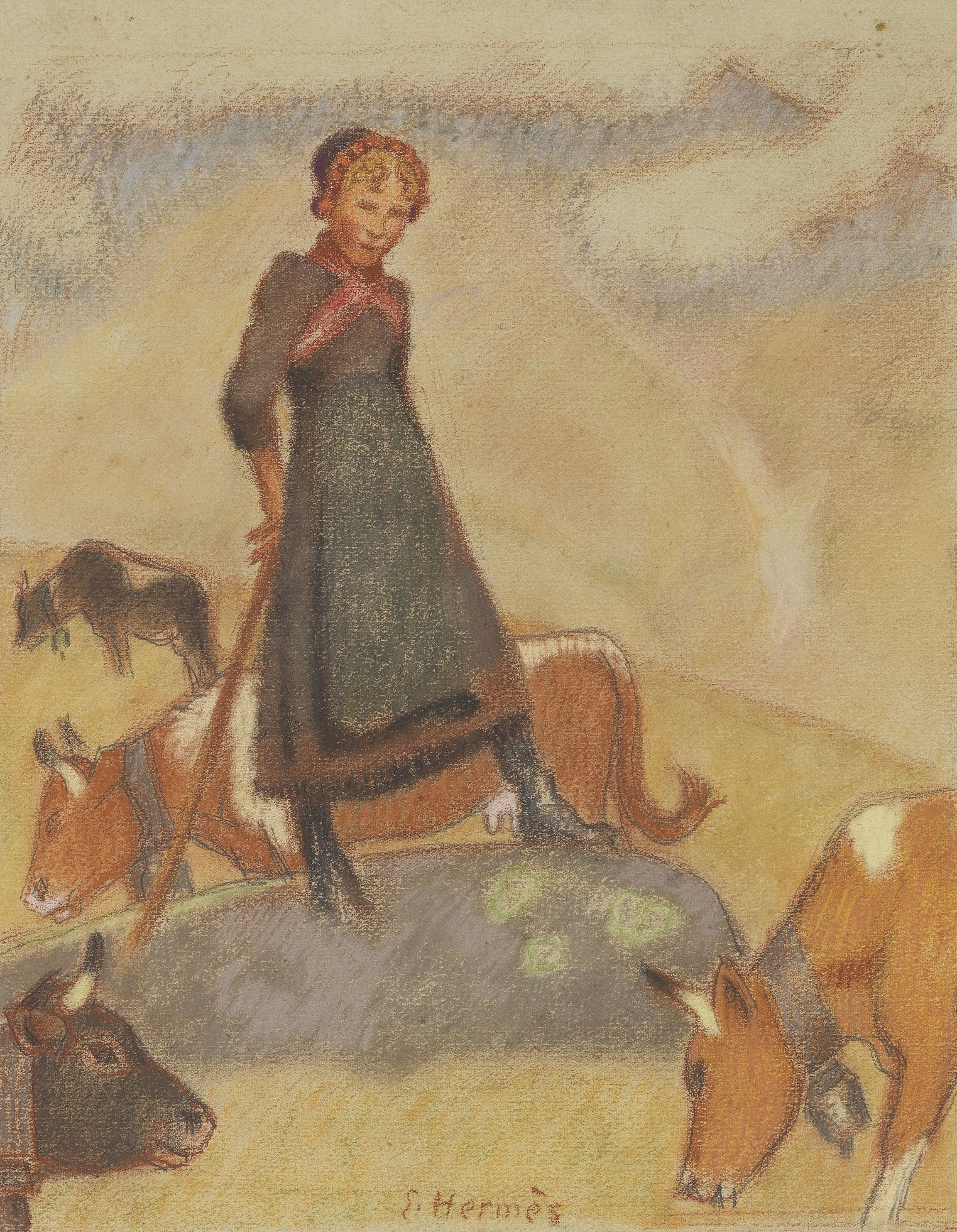 Jeune gardienne de troupeaux dans le val d'Hérens, pastel et cra...