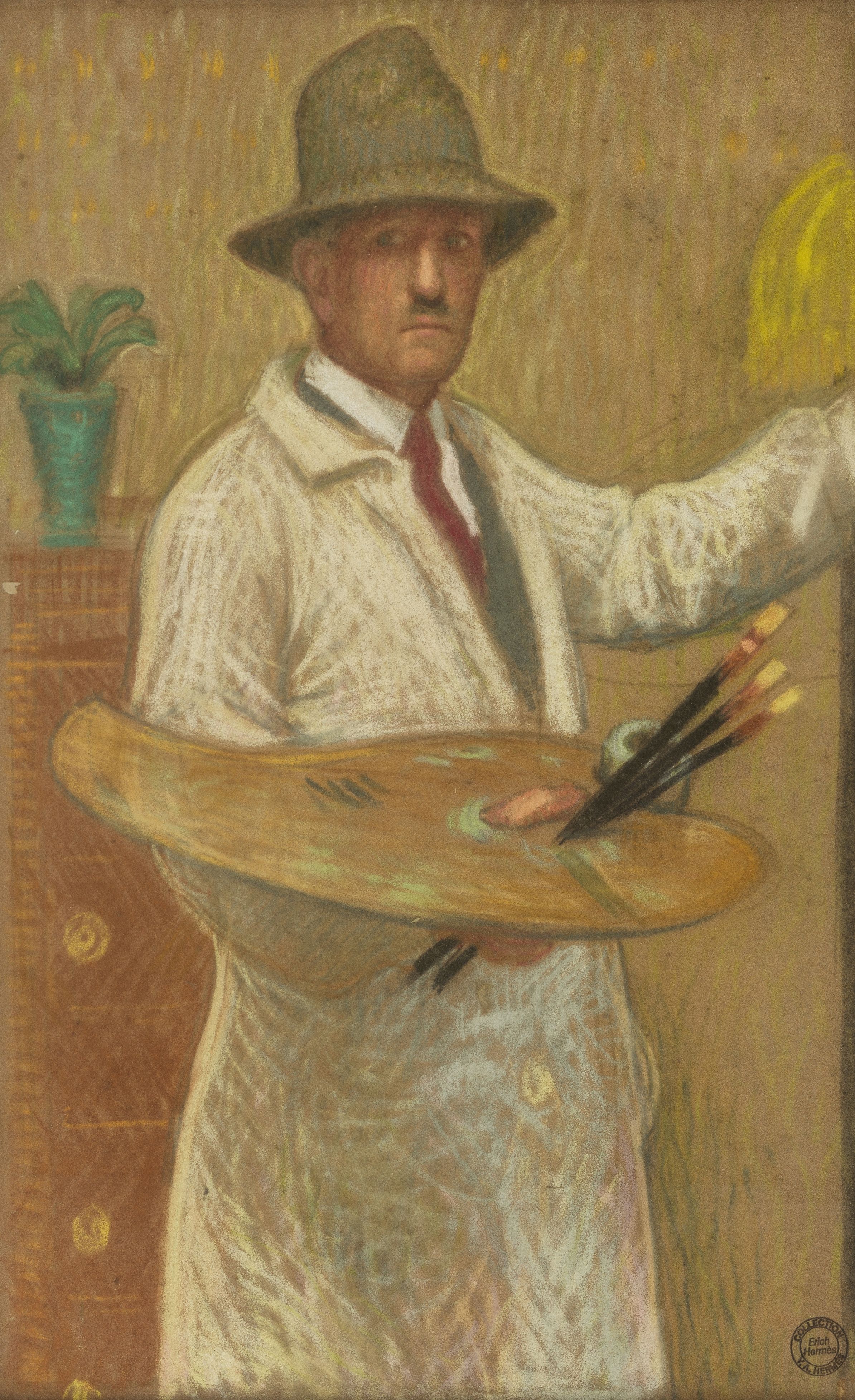 Autoportrait au chapeau et à la palette, pastel sur papier, cach...