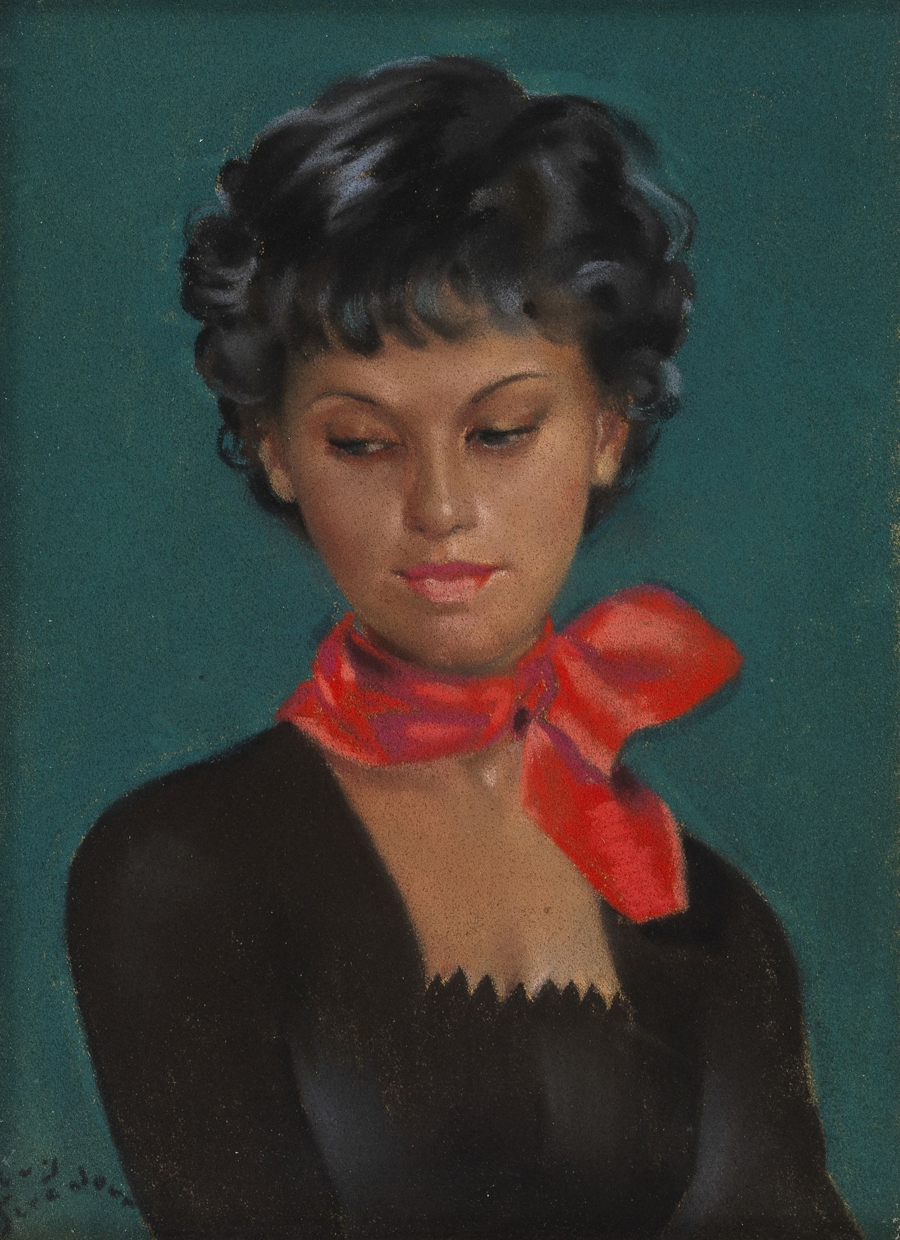 Jeune femme à l'écharpe rouge, pastel sur papier, signé, 32x23 c...