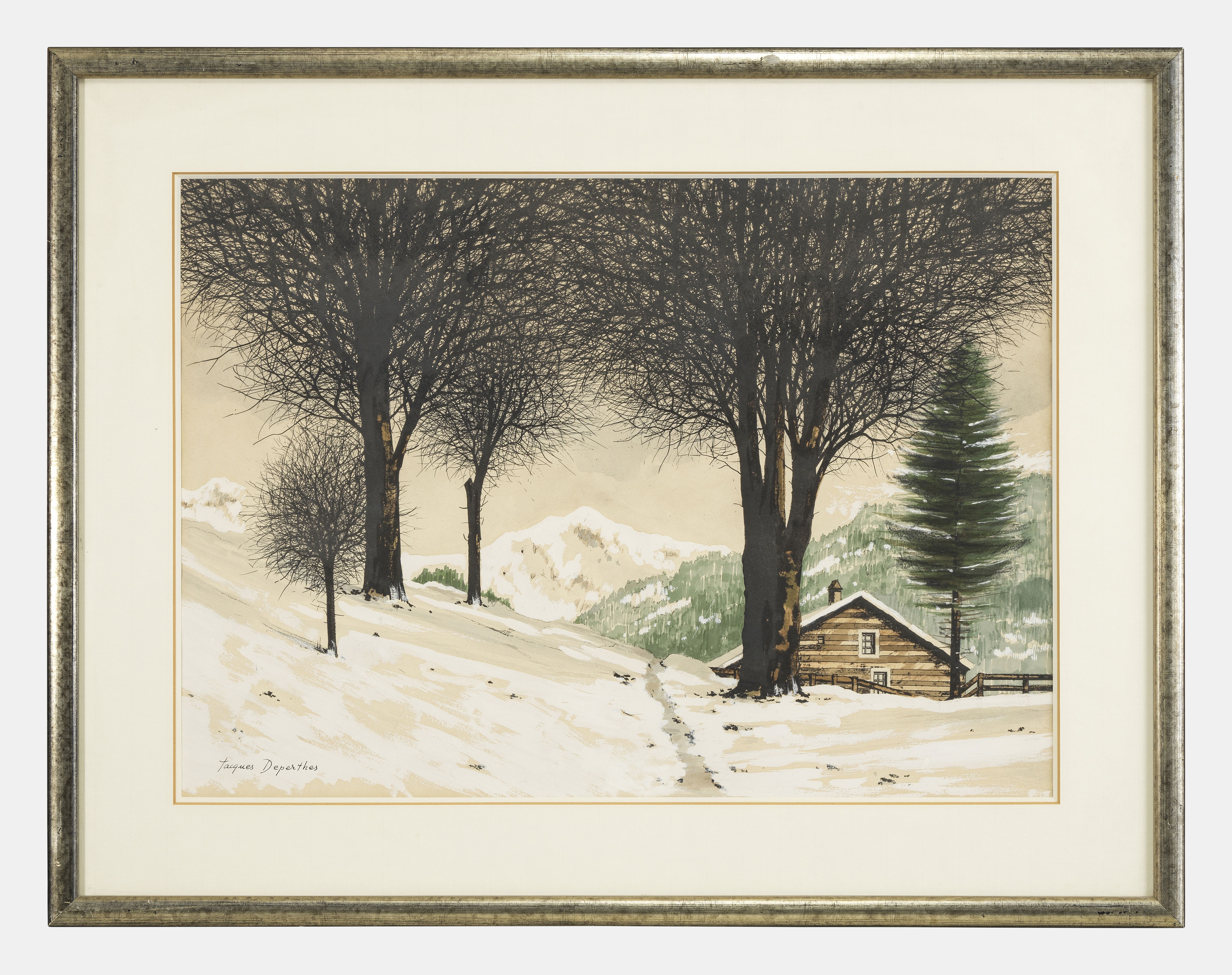 Chalet à la montagne, aquarelle et gouache sur papier, signée, 4...